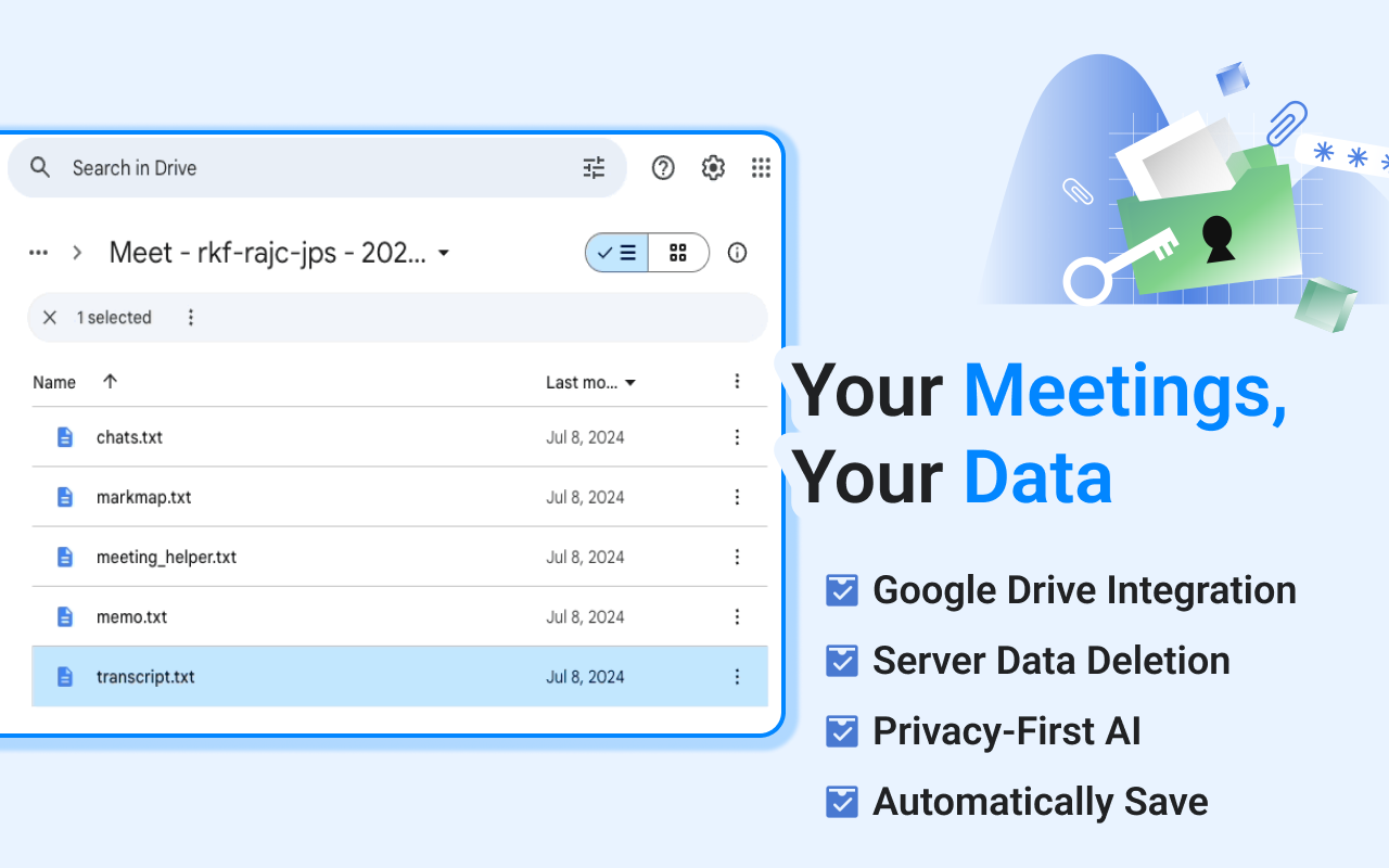2.Data privacy and ownership: The ability to automatically save meeting data directly to your personal Google Drive ensures you maintain control over your information.