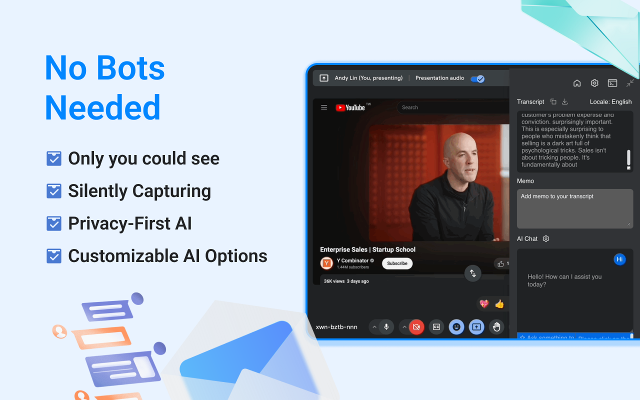 3.Invisible recording: The tool works without requiring external bots in your meetings, providing a seamless and unobtrusive experience.