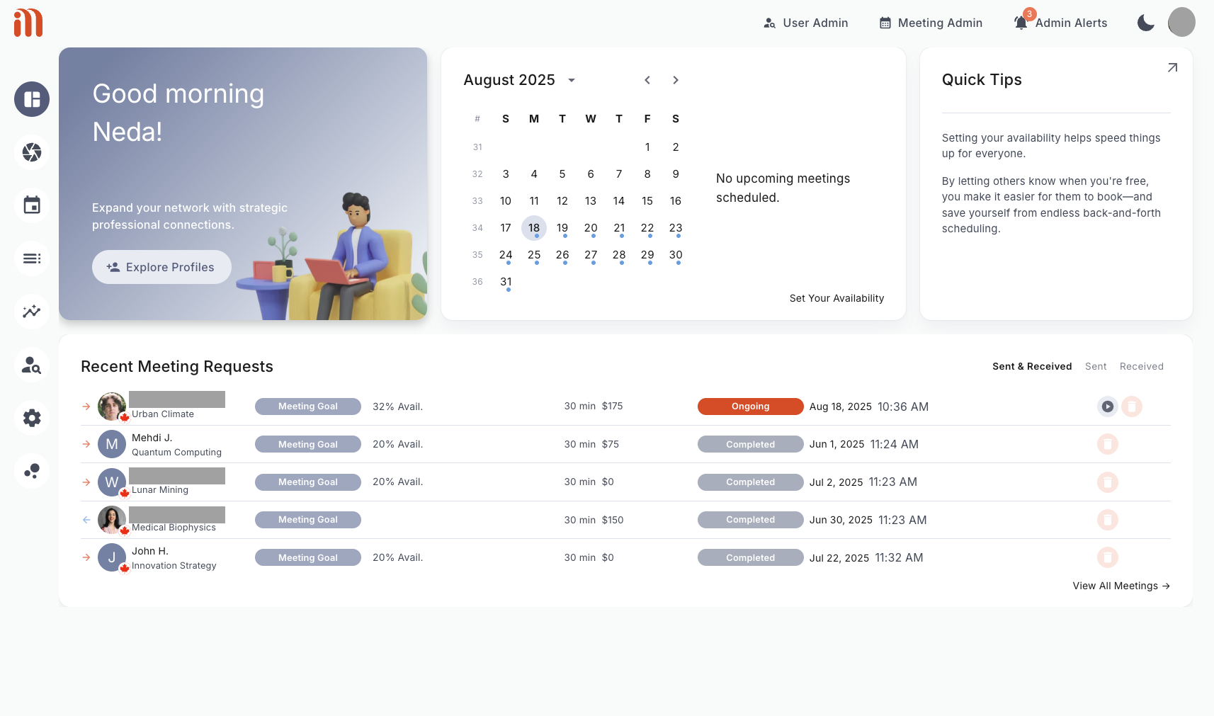 • Dashboard Overview: Manage availability, track meetings, and explore professional connections in one place. • Calendar & Scheduling: Set availability and streamline 1:1 meeting scheduling. • Meeting Requests: View and manage incoming and completed consulting sessions with ease.