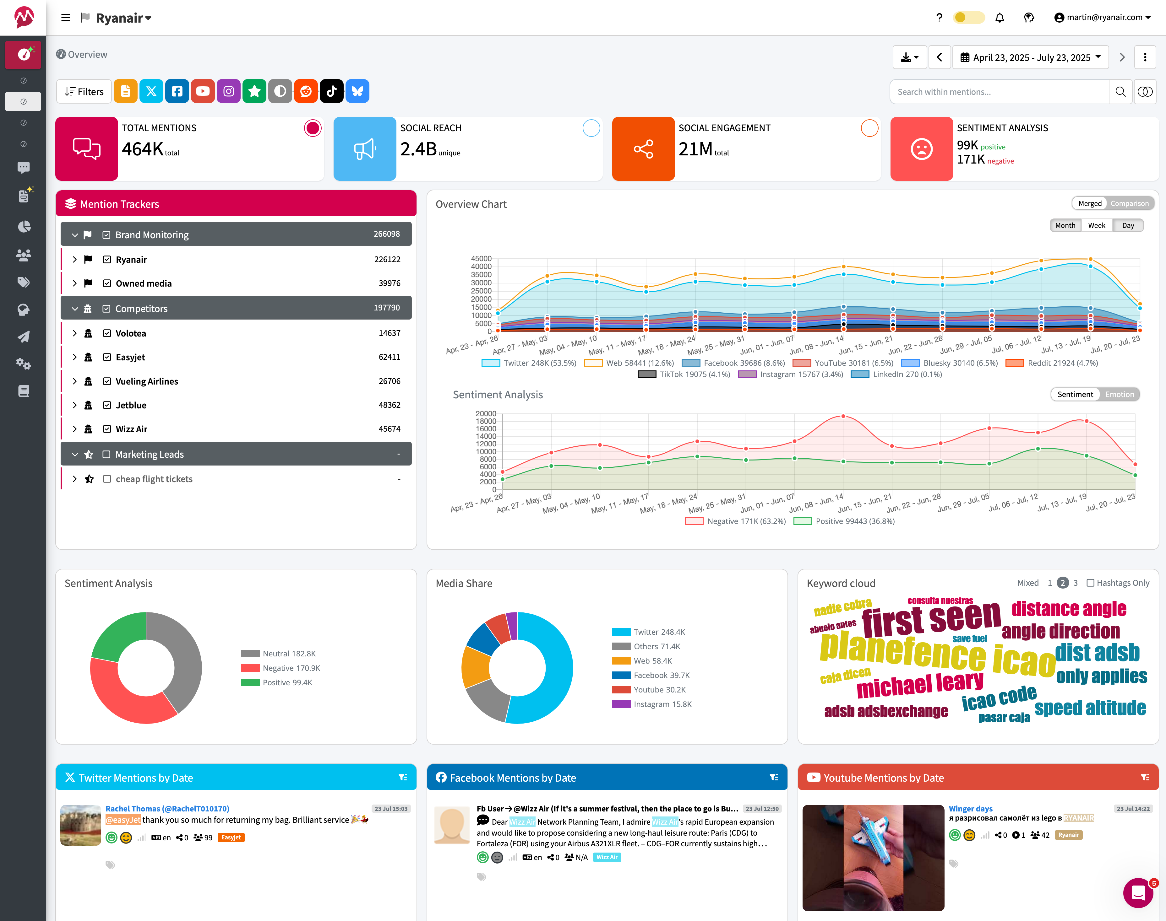 Display Mentions per channel by day, week, or month, from the selected social media channels or/and the web, in a pretty easy-to-use dashboard. Sentiment Analysis, keyword cloud, and location map are also available.