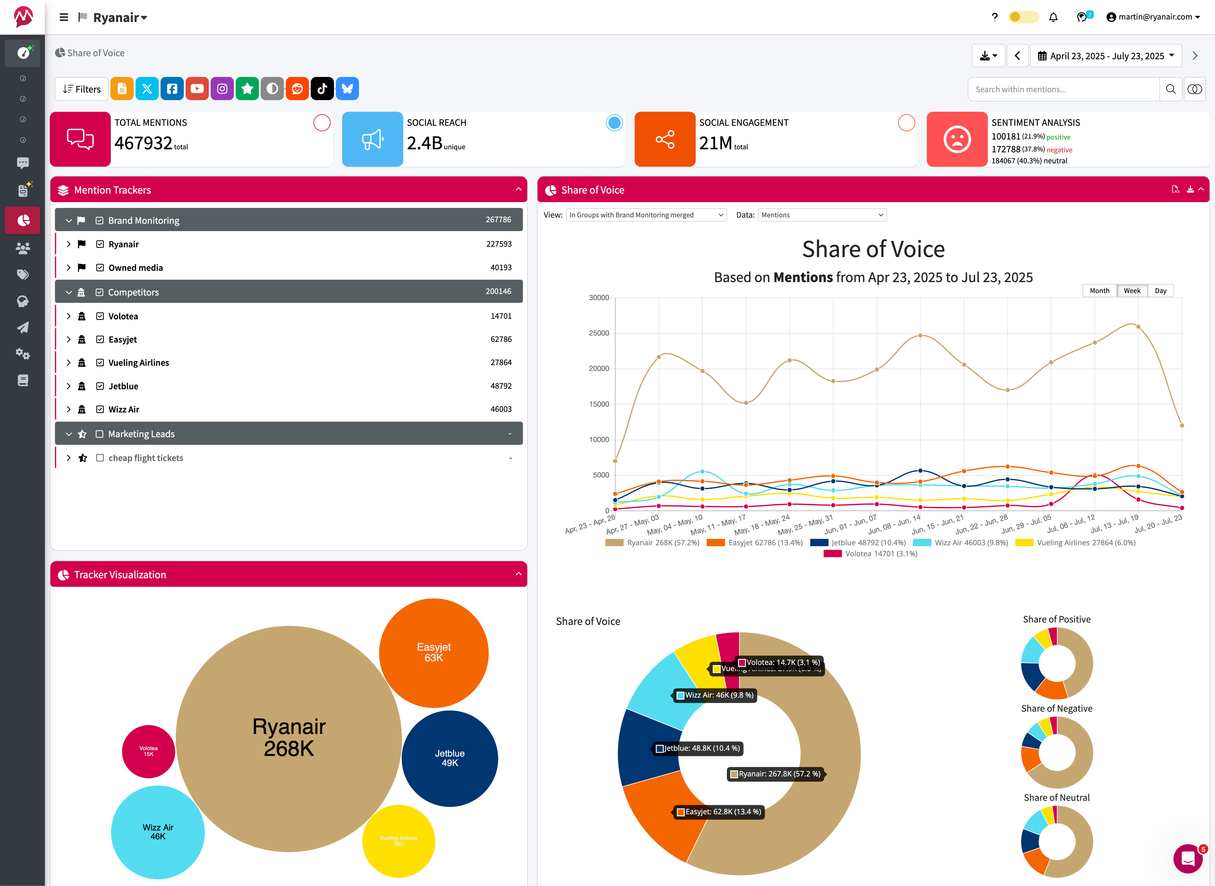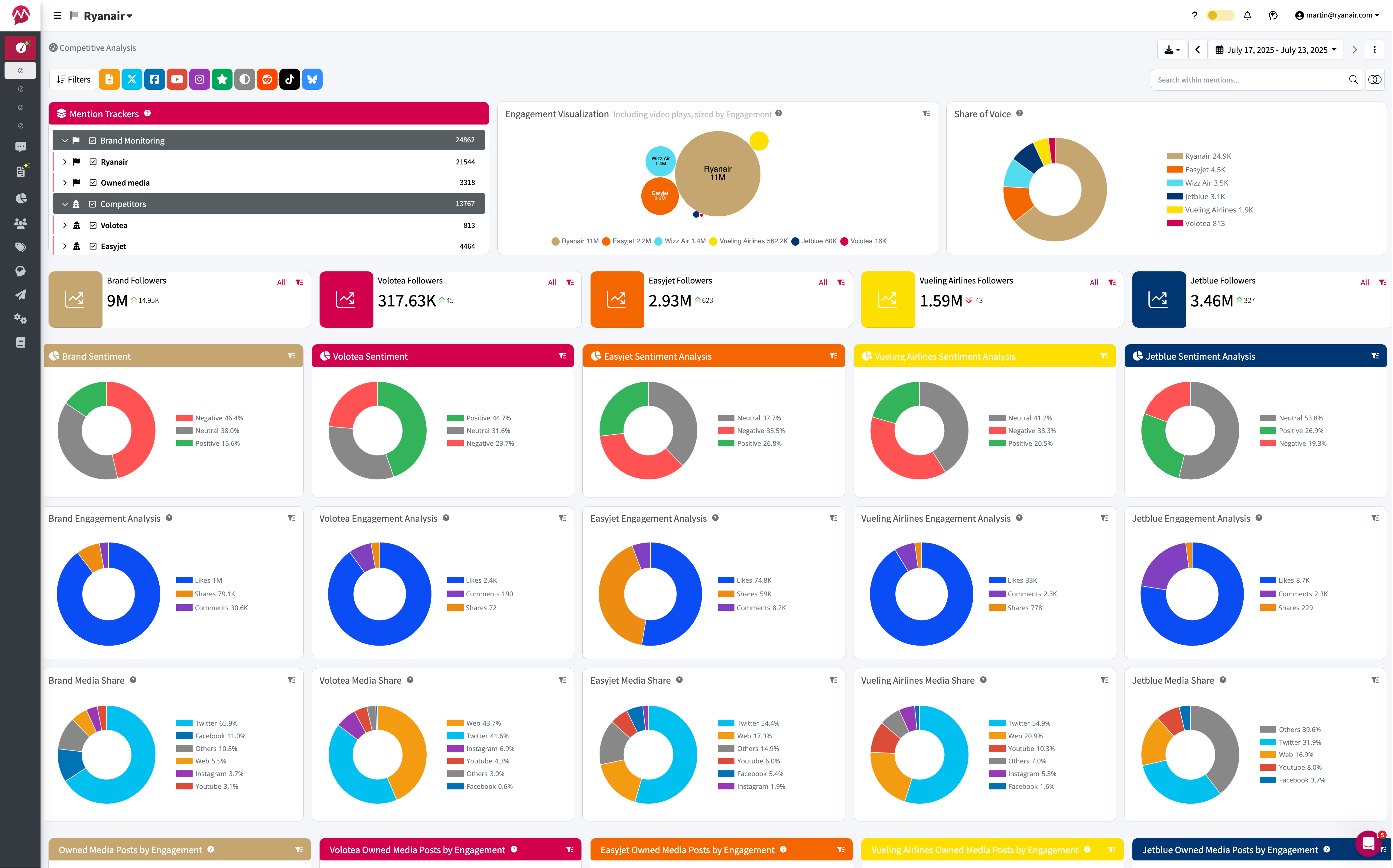 See your brand's performance against competitors at a glance. Our detailed dashboard lets you instantly compare mention volume, sentiment, engagement, top owned posts, top mentions, and more, all in one place.