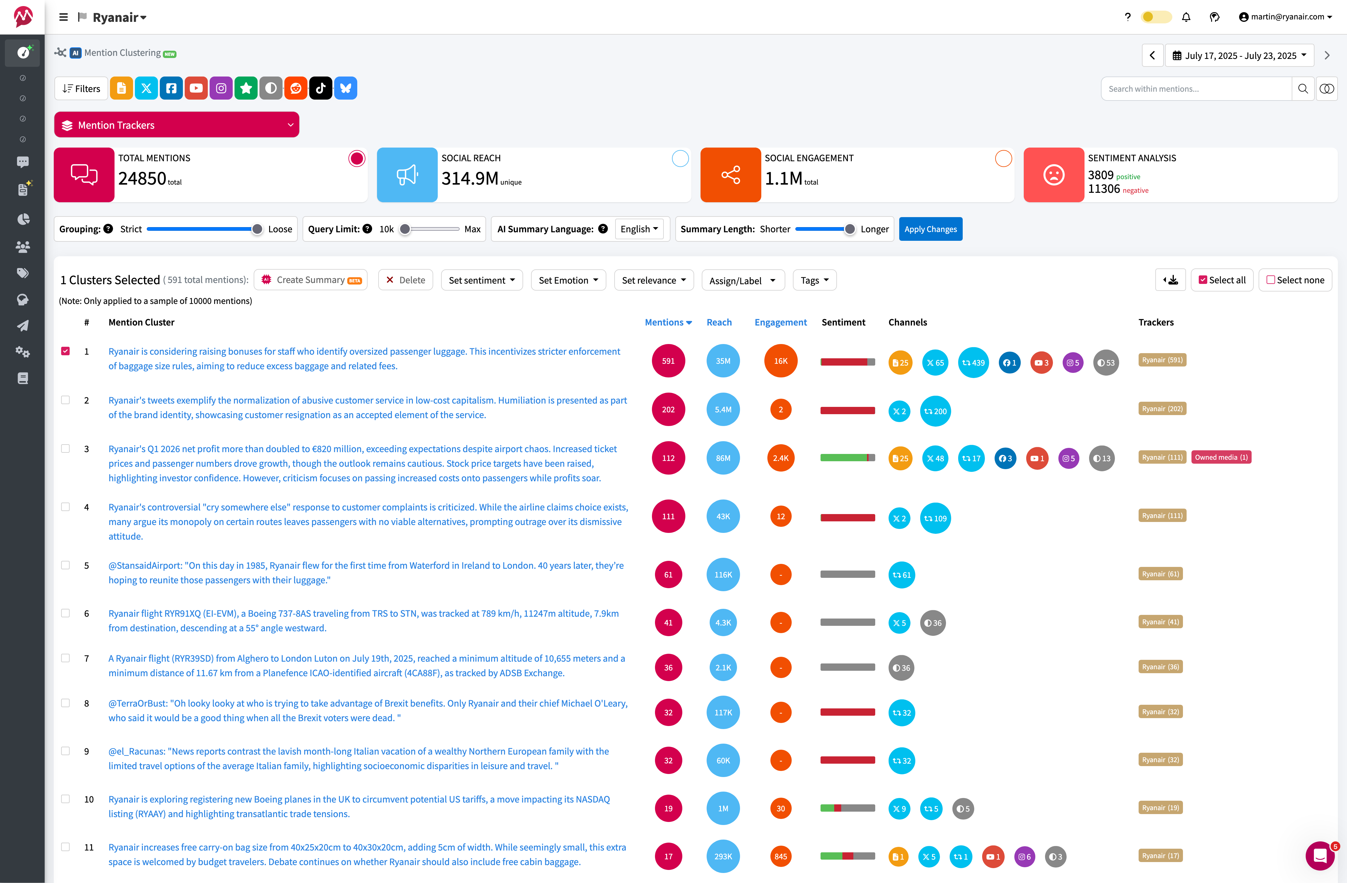 A unique AI feature that automatically groups mentions that are about the same topic, regardless of the different wording. Save an enormous amount of time, and find what are the most important mention topics, instead of going through each one individually.
