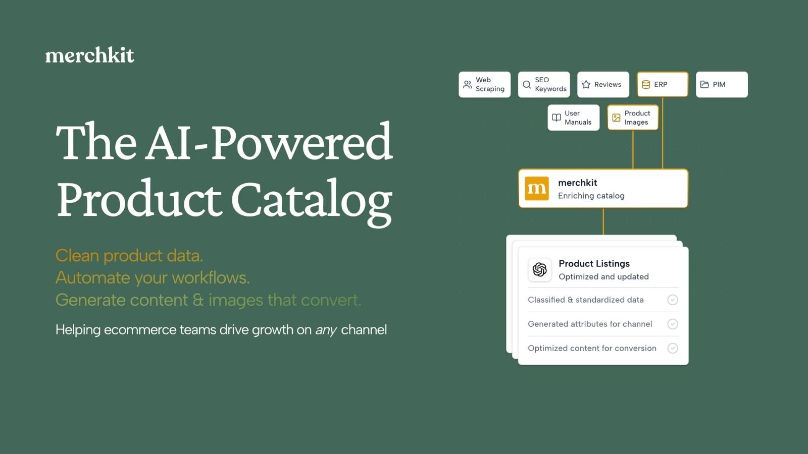 Merchkit is an AI-powered product catalog automation and management solution that helps ecommerce teams transform raw product data into clean, complete, conversion-ready product listings across sales channels. It is designed for retailers, brands, and distributors (B2C and B2B) managing product catalogs ranging from 500 to millions of SKUs.