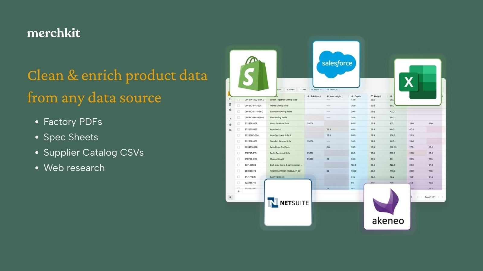 Merchkit addresses common challenges faced by ecommerce teams: fragmented product data spread across supplier spreadsheets, PDFs, spec sheets, and images; time-intensive manual data entry and normalization; inconsistent product content across channels; and difficulty meeting retailer-specific listing requirements.