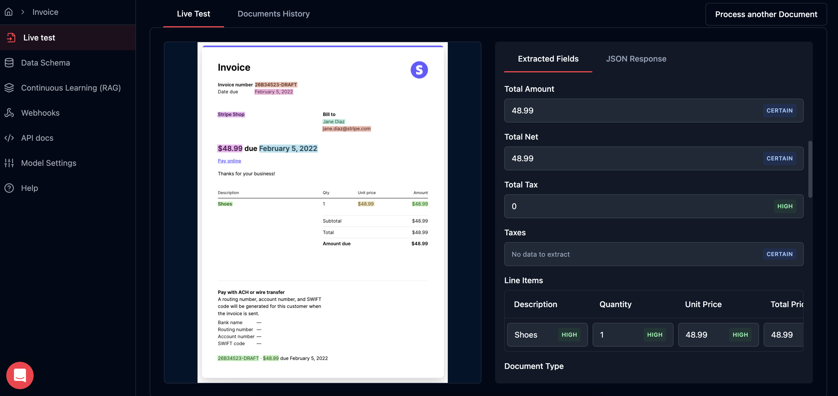 Key features of Mindee include Continuous Learning (RAG), which enables models to automatically improve their accuracy by learning from new data without the need for retraining. Additionally, the platform provides confidence scores for each extracted field, indicating the reliability of the data and supporting automated decision-making. Users can also define Data Processing Zones to ensure compliance with regional privacy laws, enhancing data security and governance. Furthermore, Mindee facilitates team collaboration through shared environments, allowing multiple users to build, test, and deploy models while maintaining access controls.