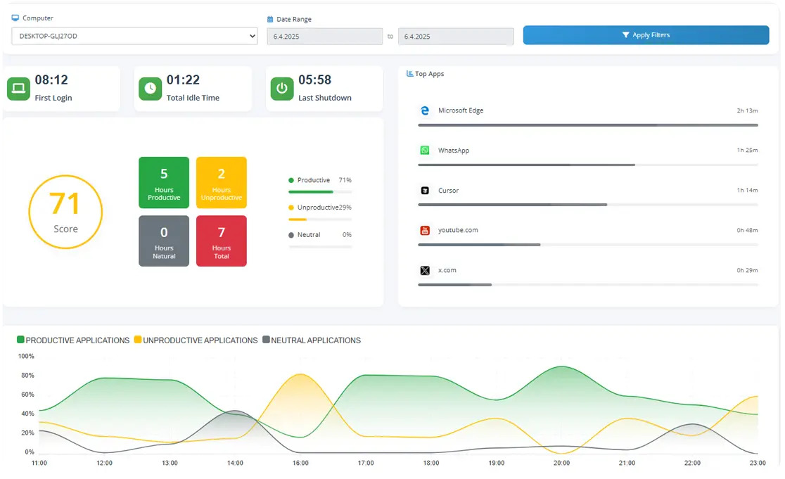 DeskTime is a real-time automatic time tracking software that tracks and analyzes your productivity by sorting the different applications that you or our employees use into the categories “productive”, “unproductive” or “neutral”.