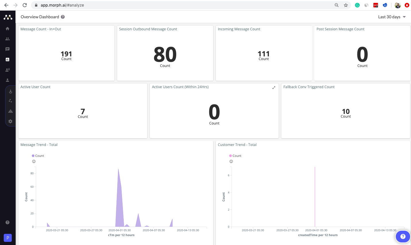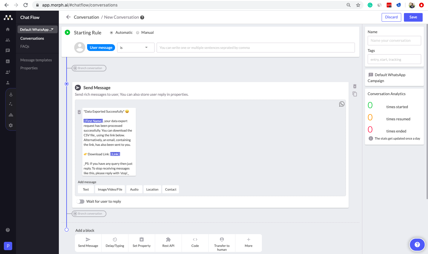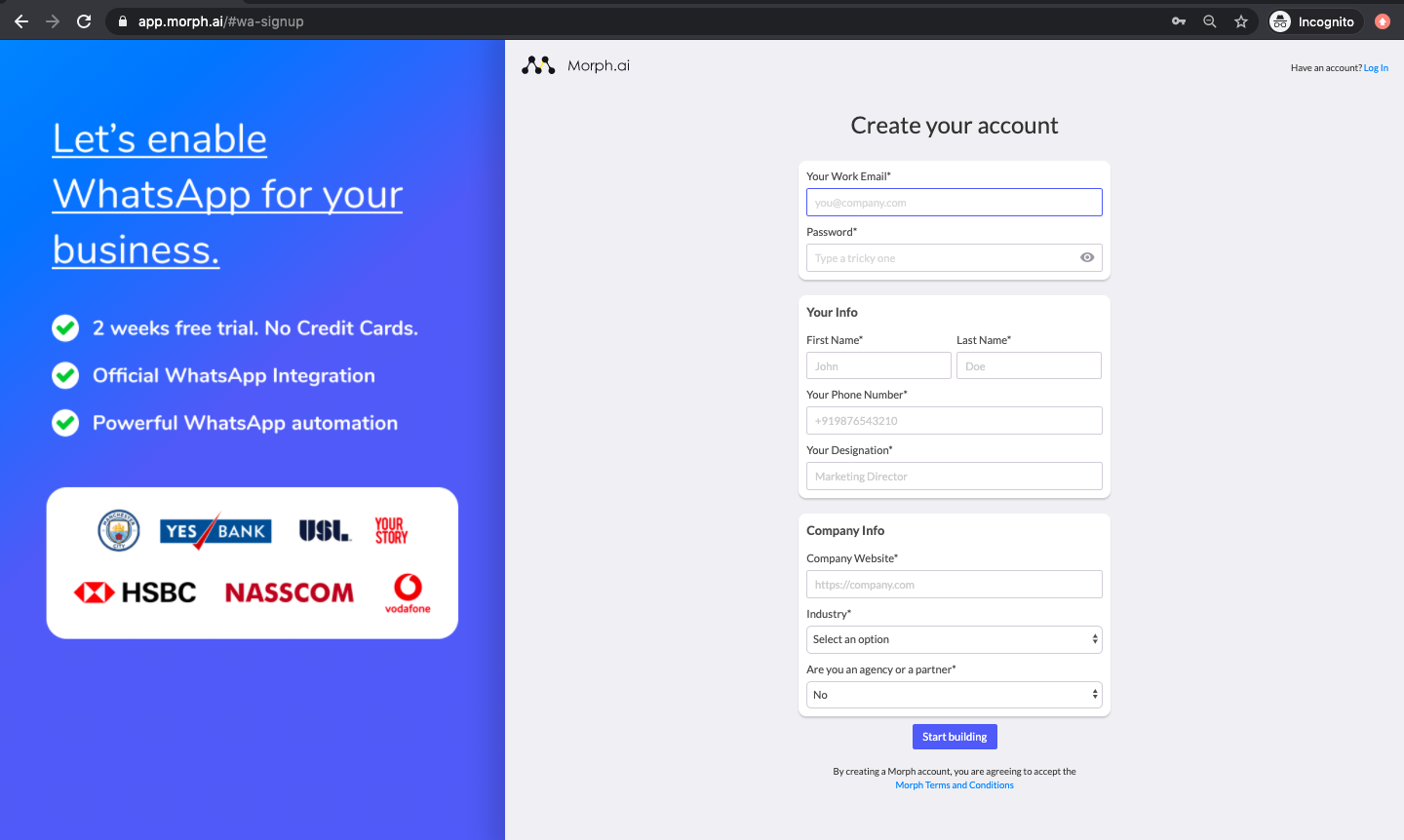 Morph.ai is a platform that on-boards businesses on WhatsApp and lets them create chat-flows for complex use cases. The platform can be leveraged to create WhatsApp chatbots for lead generation, customer support, e-commerce orders, booking of service, nurturing leads, sending notification and more