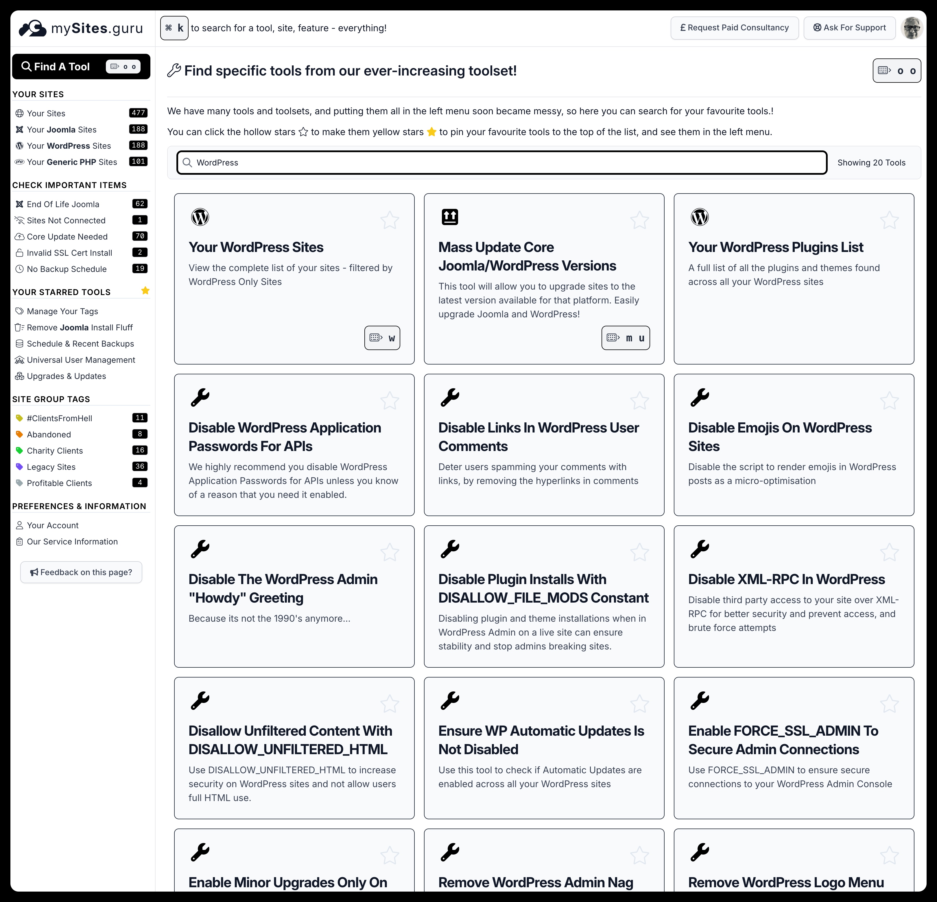 The simplicity of the site. How easy it is to quickly and easily manage multiple websites with a simple easy to understand interface. It's comprehensive reporting and auditing tools giving precise information on every aspect of a website, from version, extensions, files, best practice and even hosting information. The support provided by Phil Taylor is excellent, quick and incredibly helpful. Review collected by and hosted on G2.com.