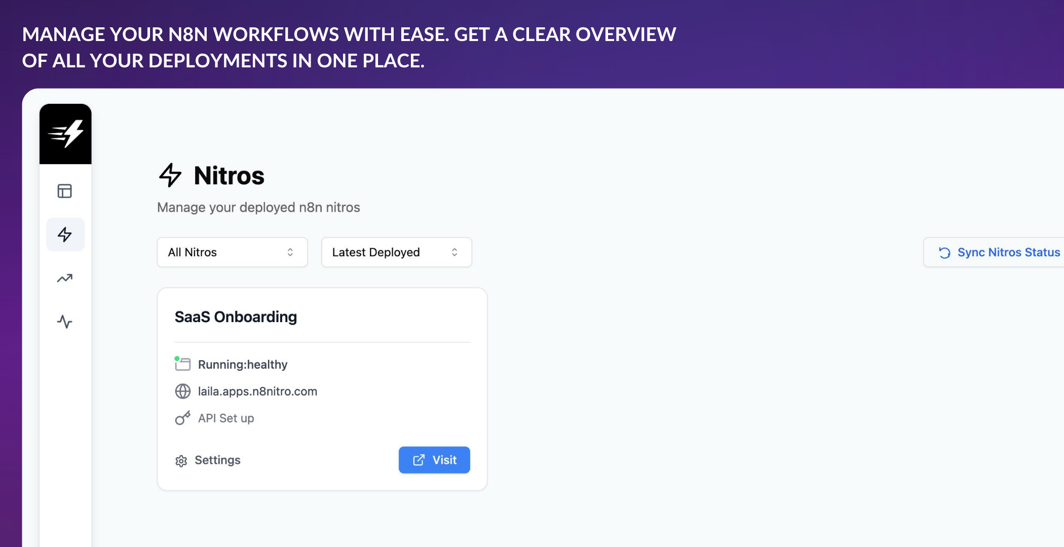 N8Nitro makes running self-hosted n8n incredibly simple. I don’t need to manage servers, Docker, or any DevOps setup. Deploying an instance takes seconds, and performance is consistently fast thanks to auto-scaling and NVMe storage. The dashboard is clean, the uptime is solid, and support is quick and helpful whenever I need it. Review collected by and hosted on G2.com.