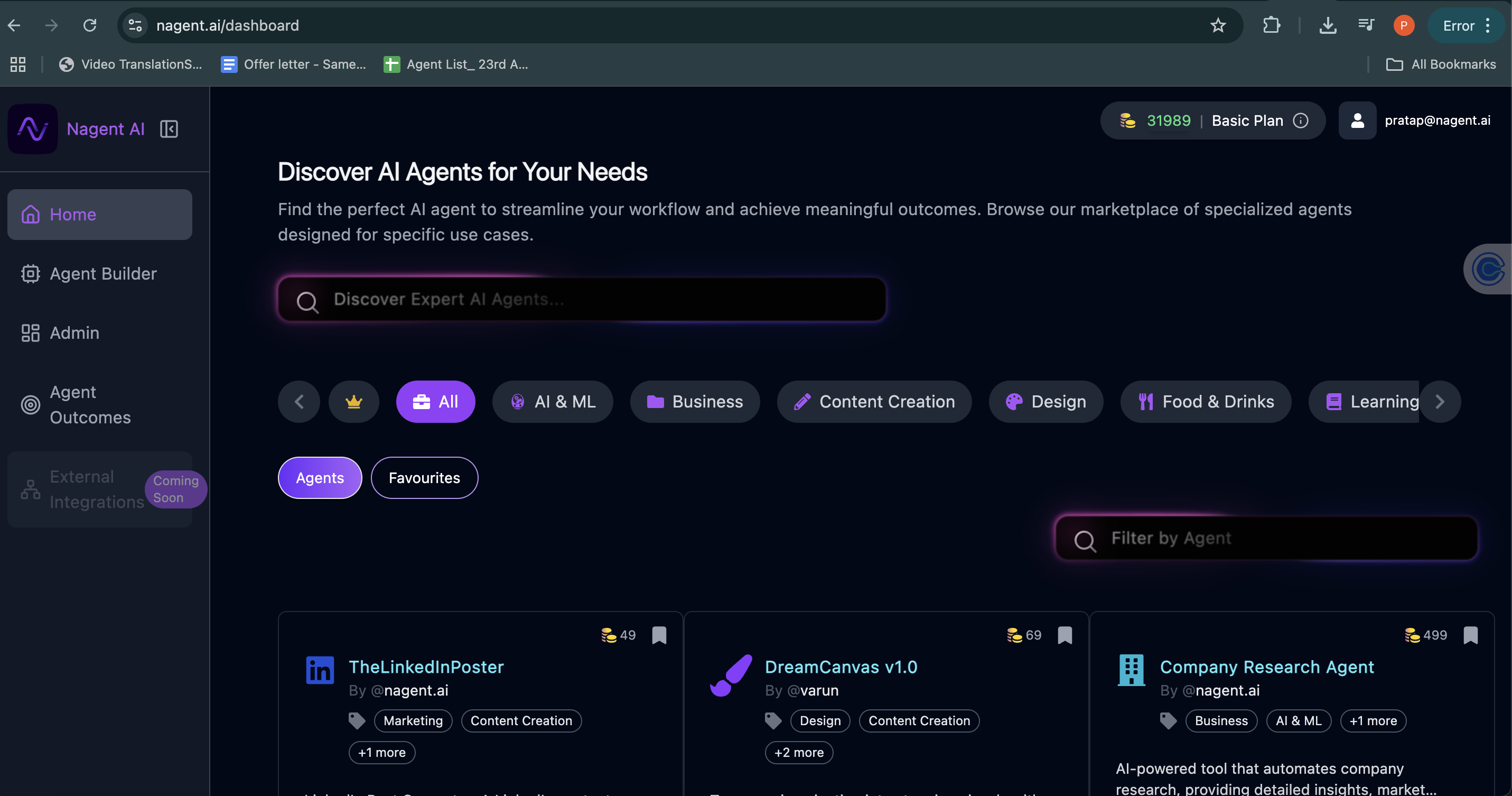 Think of it as an “App Store for AI workflows.” Each listing is a ready-to-run agent built by a domain specialist (marketing, research, ops, support, design, etc.) and powered by Nagent AI’s multi-model engine.