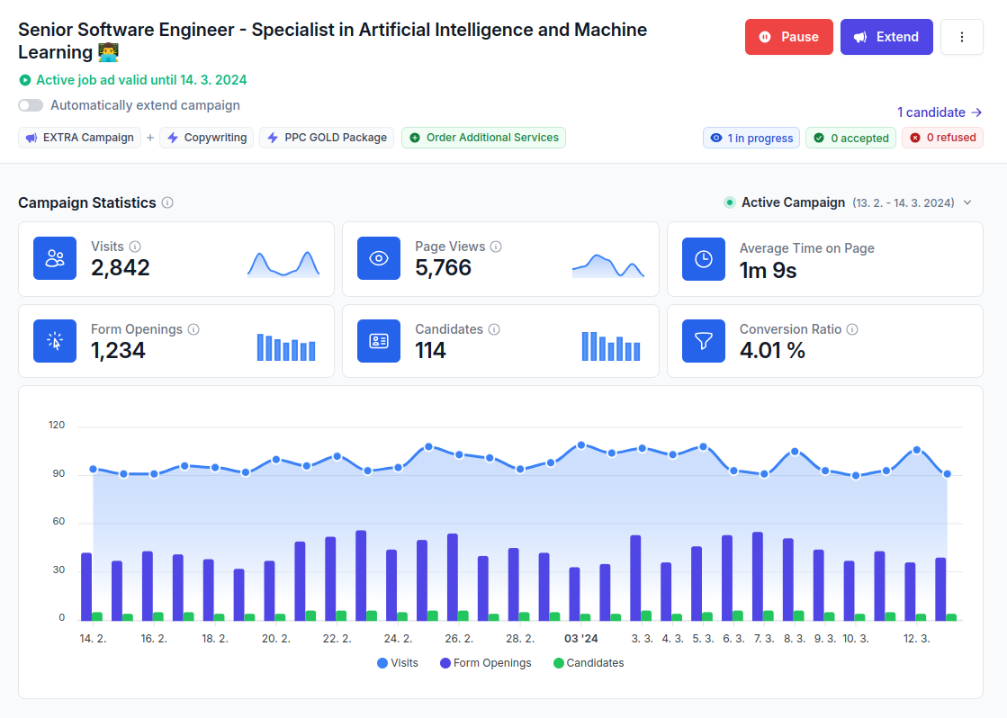 Build brand awareness and market open roles across multiple channels — including Google, Facebook, job boards and your career site — to connect with top applicants.