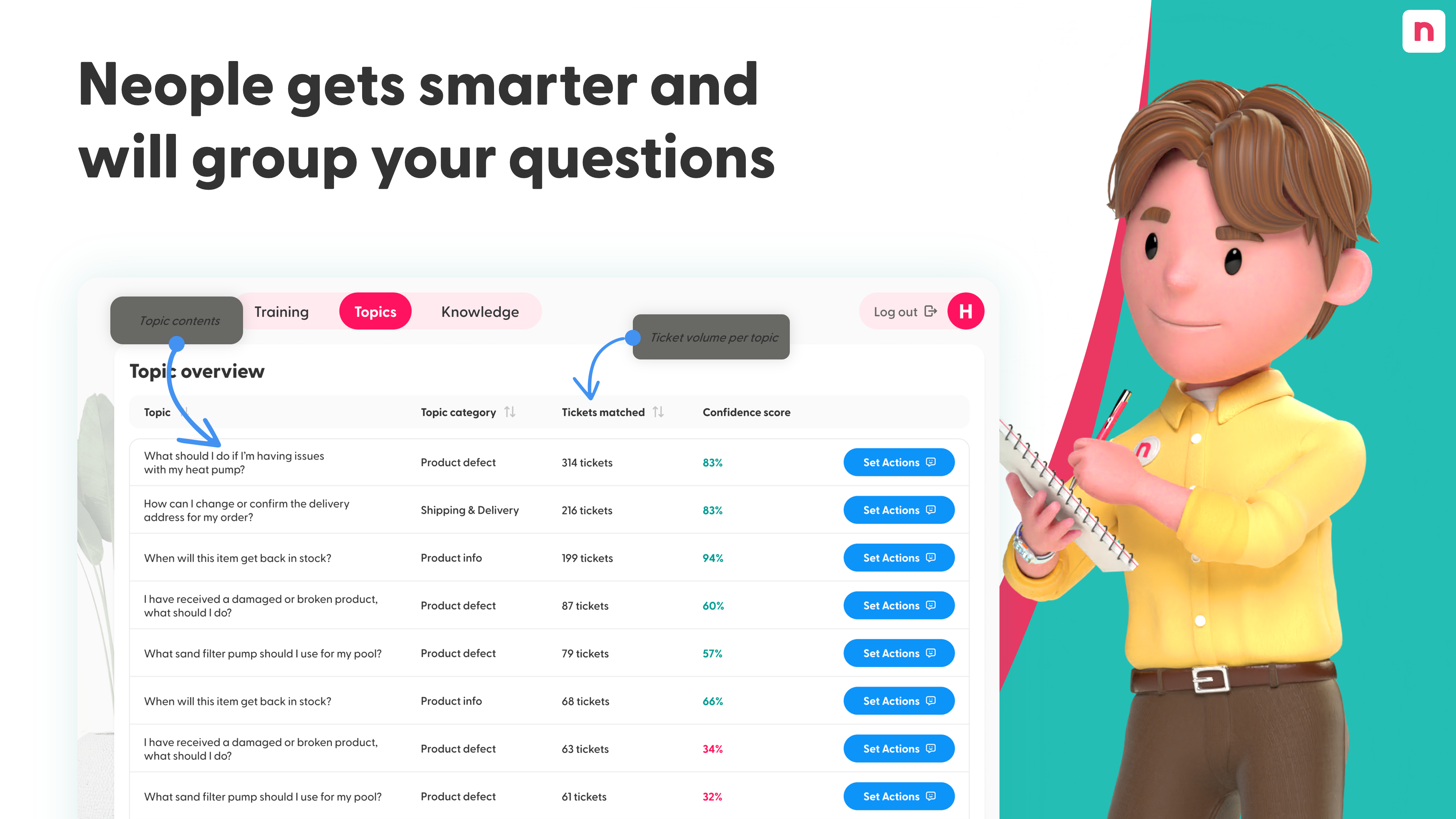 A Neople is available 24/7 to help with multiple support tasks. This allows your customer service team to provide quick answers in a friendly manner, always based on the right information.