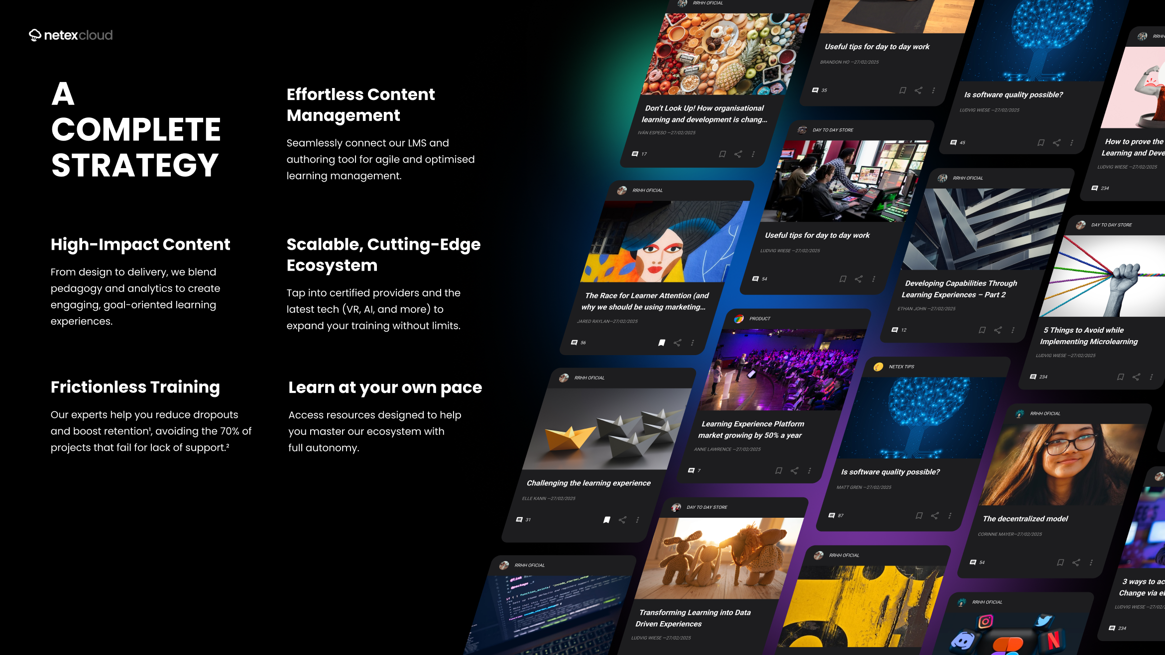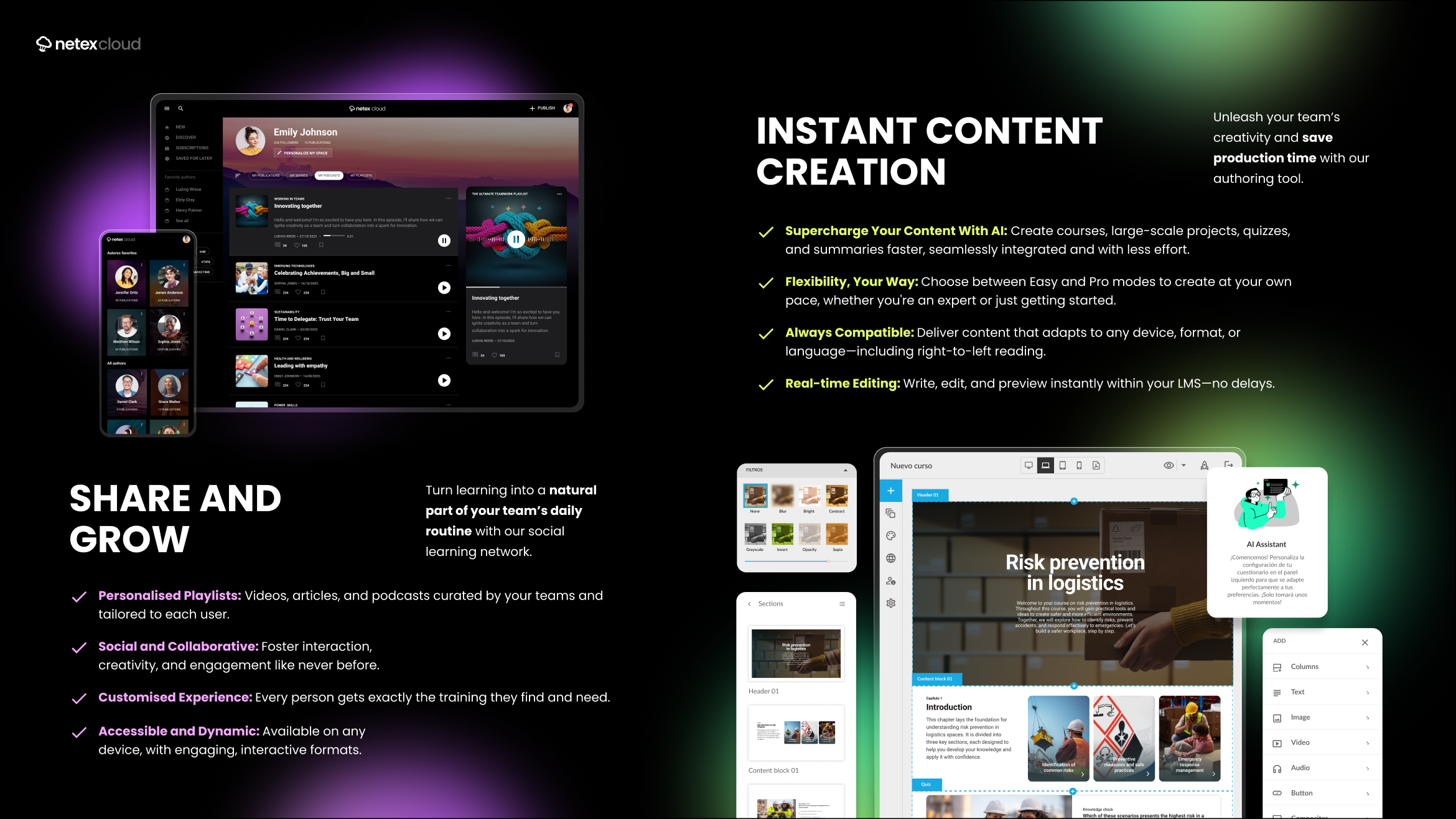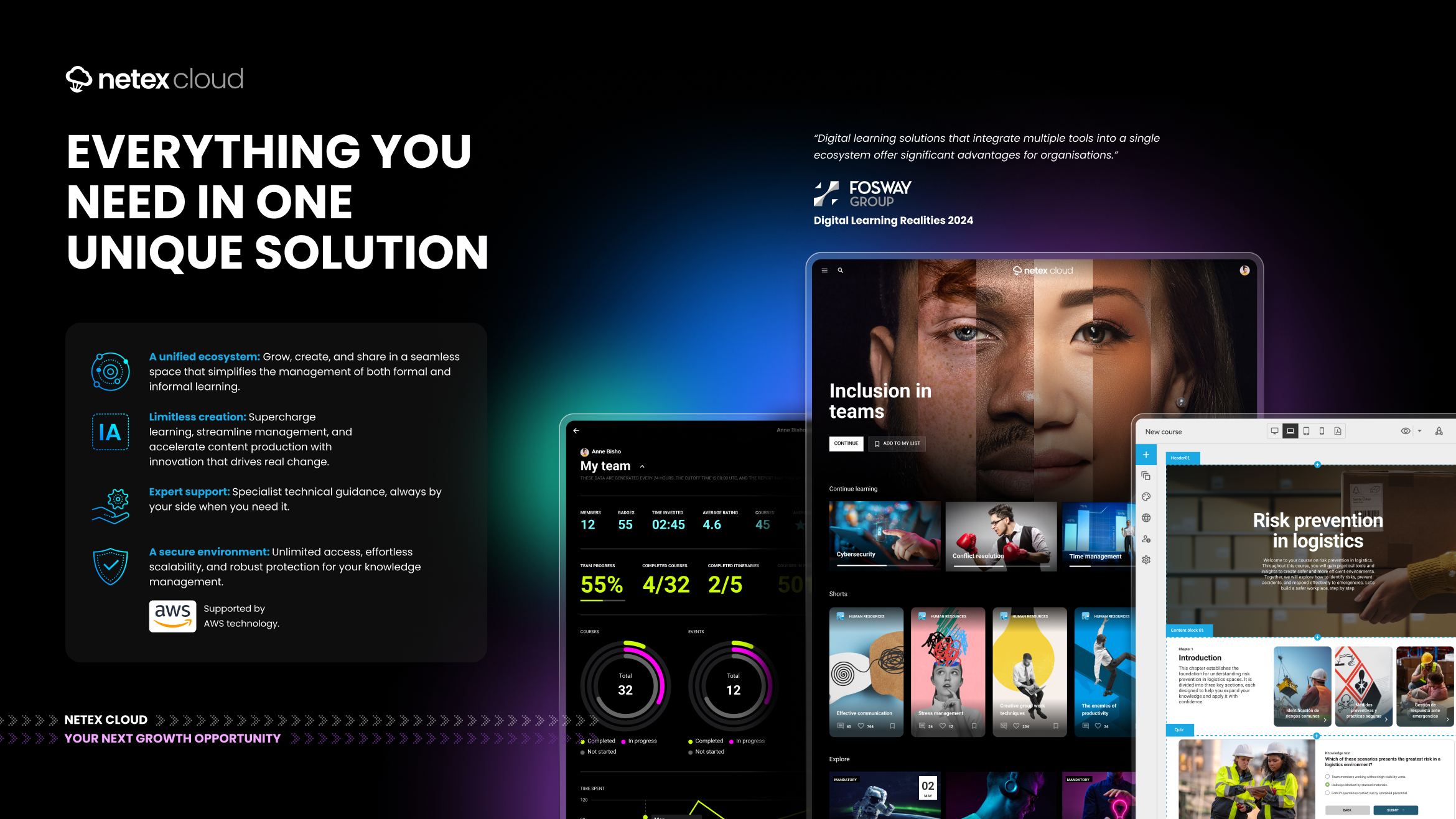 Netex Cloud is an enterprise learning management system (LMS) and corporate training platform that combines learning delivery, AI-powered tutoring, content authoring, knowledge sharing, and curated eLearning content in a single, unified solution.