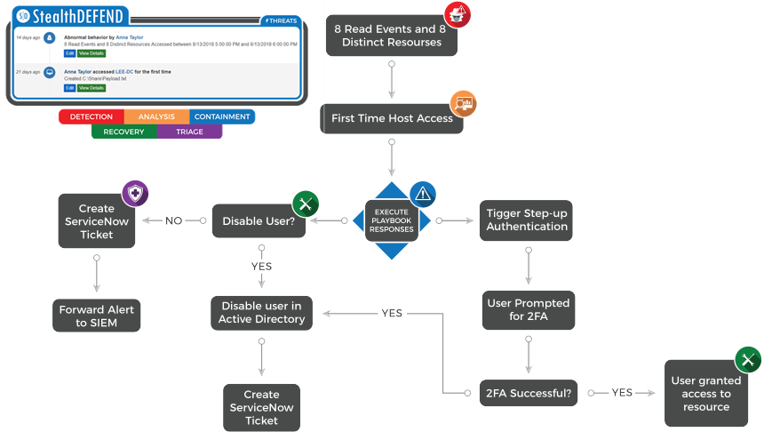 - Response Playbooks – Netwrix Threat Manager's actions engine automates security responses and connects various security applications and processes together with multi-stage actions. Out-of-the-Box or custom "Playbooks" can be leveraged to respond to threats automatically or programatically.