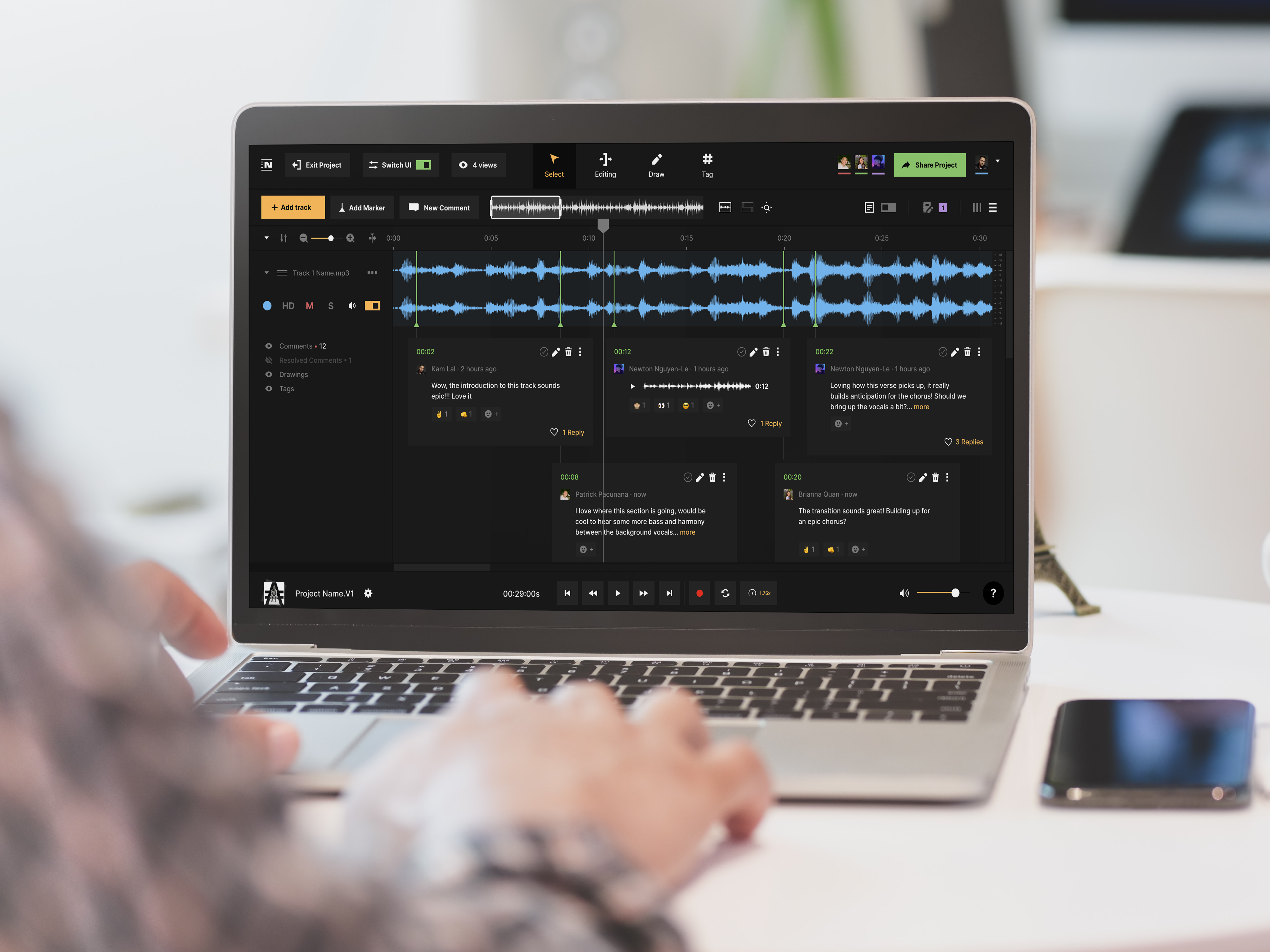 Record remote interviews in studio quality with local recordings of each track, up to 4K video and lossless WAV audio for every participant – no fancy equipment required. Our intuitive multi-track editor includes easy-to-use tools like auto leveling, trimming, fade in & out, and a library of 7,000+ professional music tracks and sounds to make editing your content a breeze. Enhance your content with AI-powered audio processing to give it that professional studio touch, along with echo & noise cancellation, and 1-click silence removal.