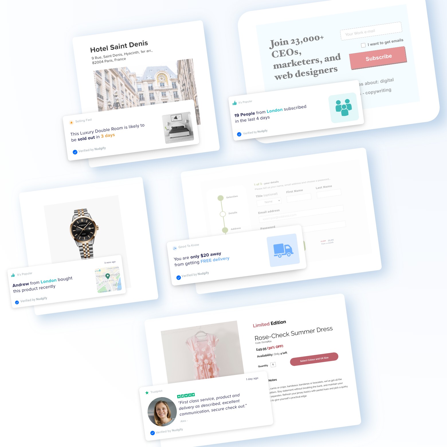 Nudges turns live data into Social Proof and Sales Pop notifications such as Recent Sales, Live Visitors, but also Google and TrustPilot Reviews. Adding real-world context to your online business helps you to build trust and increase conversions.