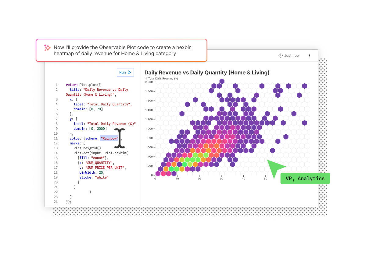 It makes the data analysis process more streamlined by bringing querying, chart creation, and sharing all in one platform. Users can choose between code, UI, or AI, and easily move between all three depending on the task at hand. The AI is also deeply integrated and turnkey, operating transparently on the canvas to allow users to understand, interpret, and fine-tune its results and reasoning, building trust in its recommendations. Additionally, whiteboarding features like comments, illustrations, and annotations help bring stakeholders into the data analysis process to reduce frustrating back-and-forths. Sophisticated data visualizations such as beeswarms, Sankey diagrams, choropleths, and more are available out-of-the-box to enable users to easily create and share expressive, interactive charts. Users can embed charts in internal apps, and generate polished, stakeholder-friendly dashboards in just a few clicks.