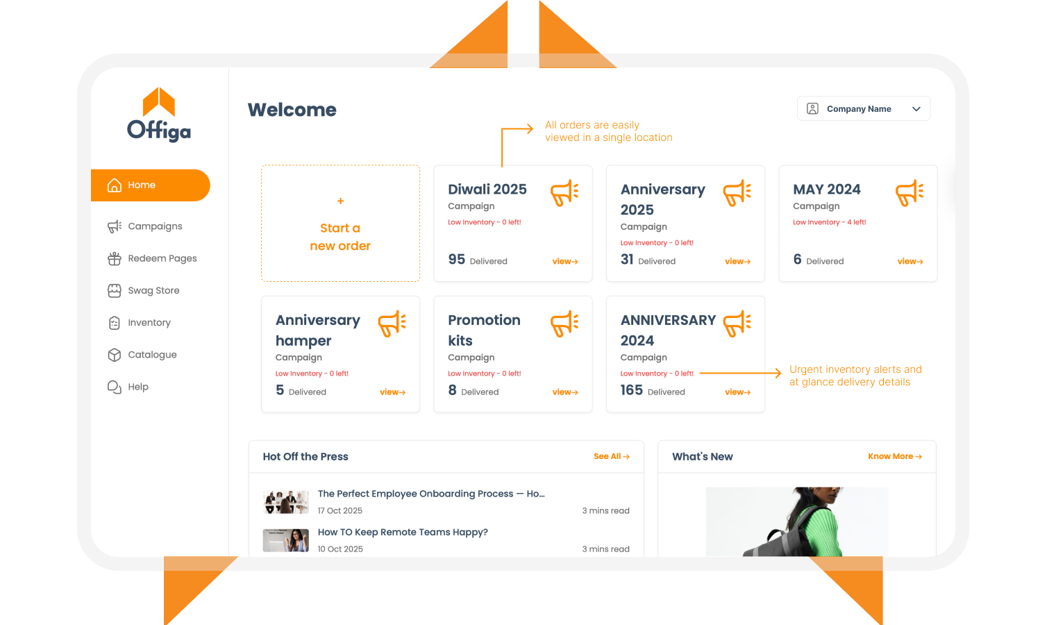 Most enterprise gifting platforms promise simplicity but deliver complexity. Offiga is different—India's first gifting dashboard built for HR and procurement teams who need speed, transparency, and actual control over their corporate gifting programs without the operational headaches.