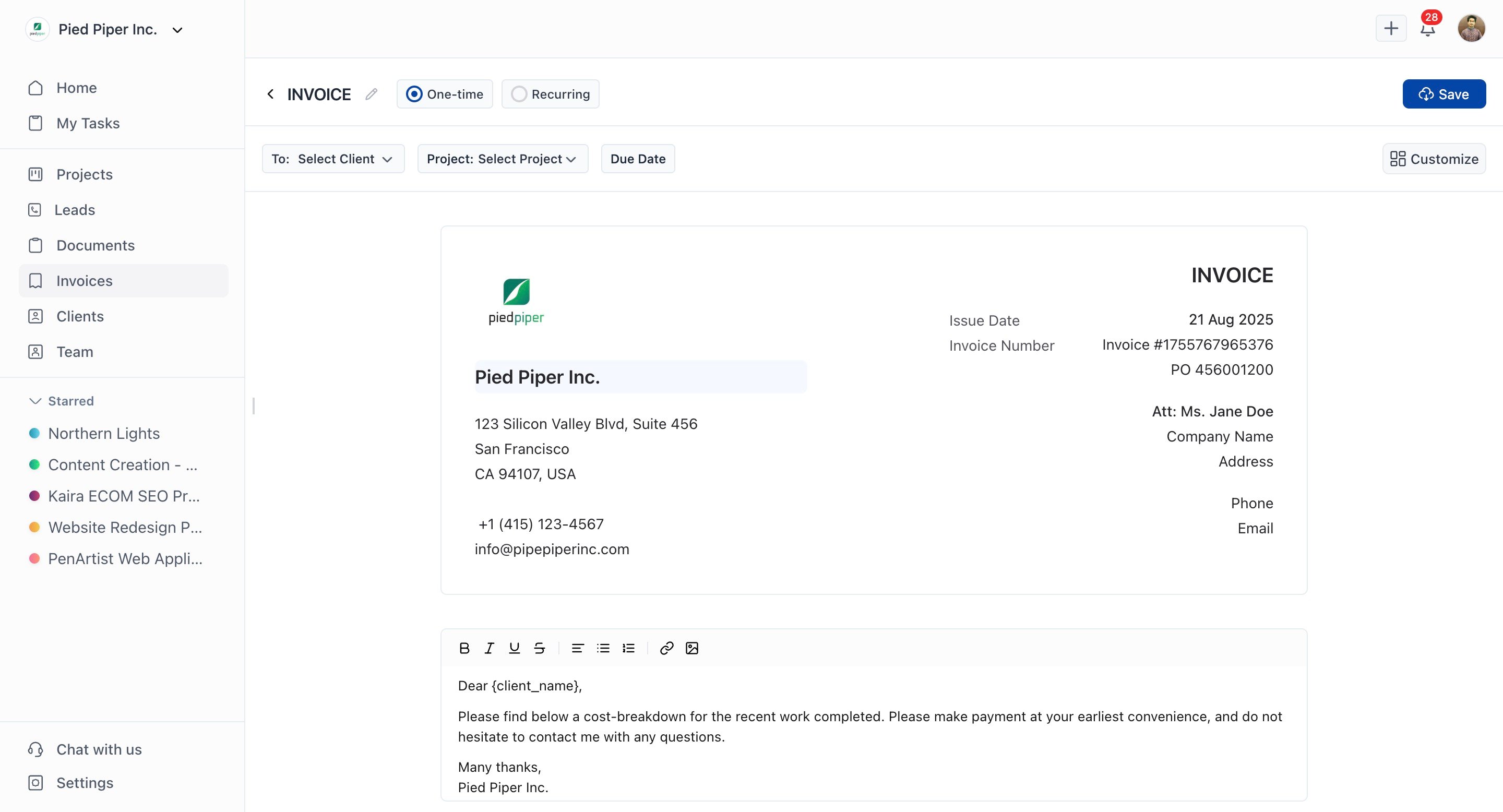 Billing is also handled with client work in mind. You can create one-time or recurring invoices, perfect for agencies that sell monthly retainers or ongoing service packages. Clients can pay online through trusted providers like Stripe, PayPal, Razorpay, or QuickPay. Recurring invoices mean you spend less time on admin and more time delivering value.