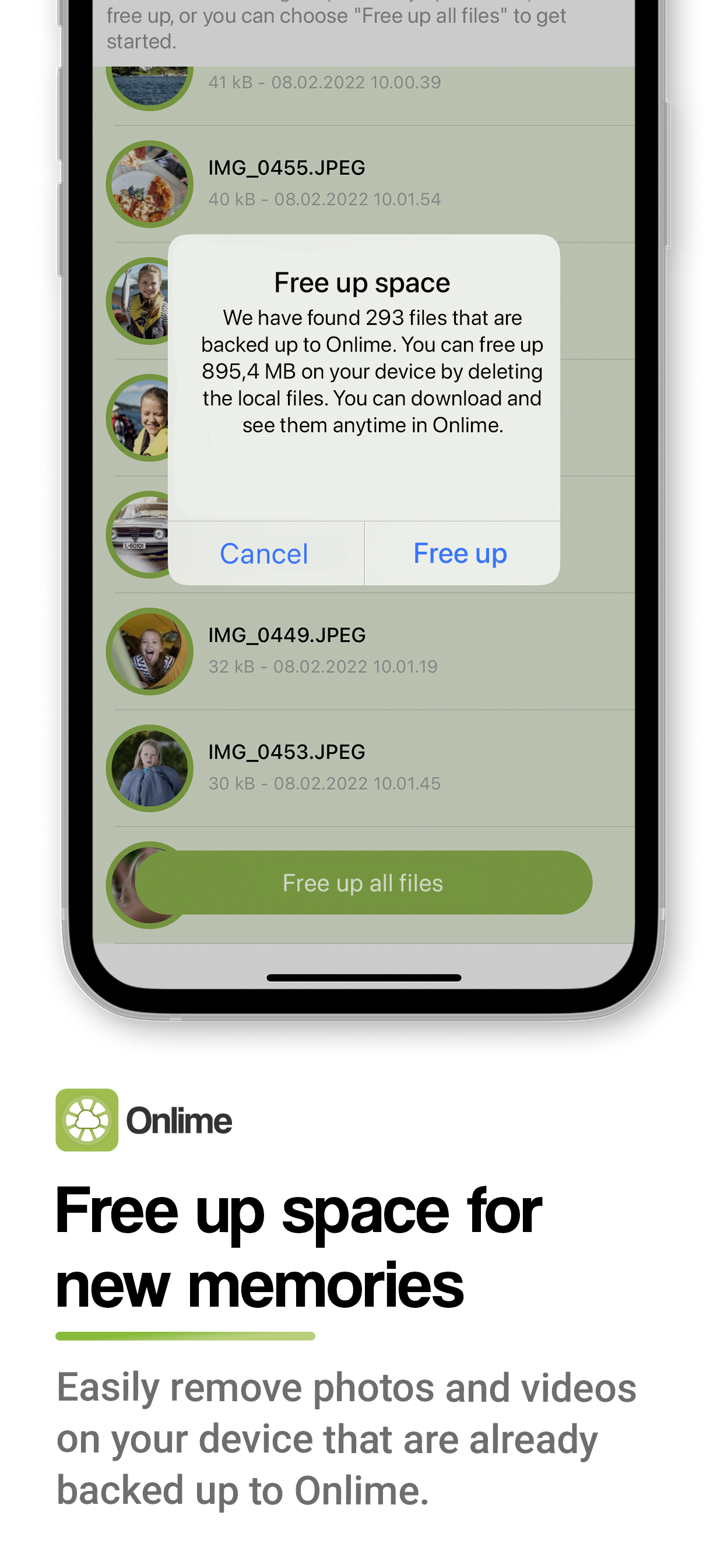 • FREE UP SPACE: With one tap, you can remove photos and videos on your device, that are already backed up with Onlime.