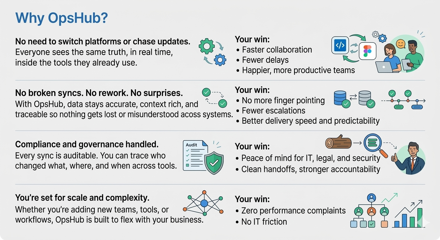4) Scalable integrations without slowing down end systems: Run integrations externally without installing plugins inside connected tools. This architecture enables organizations to scale synchronization across multiple systems while avoiding performance impact on operational platforms.