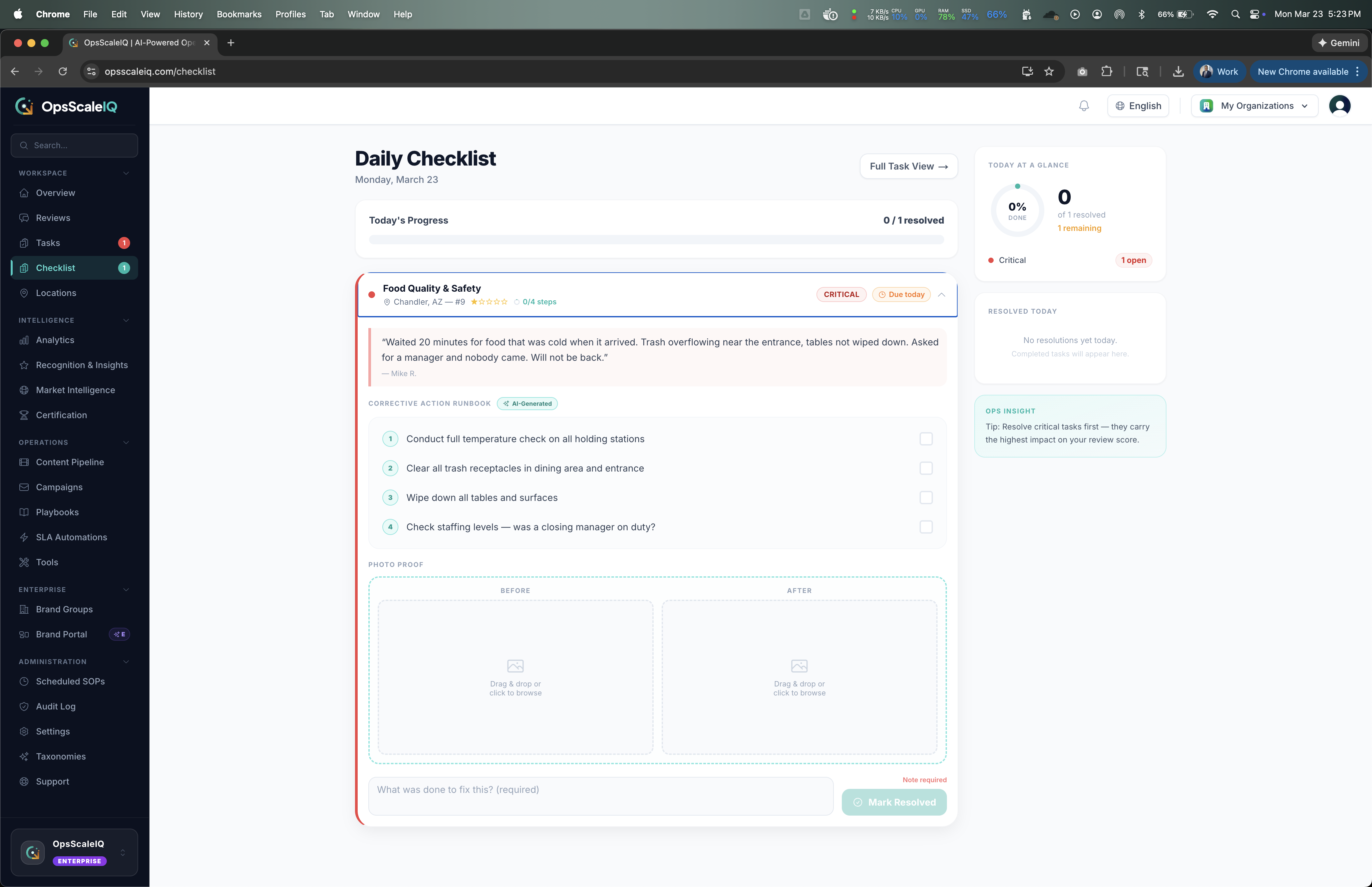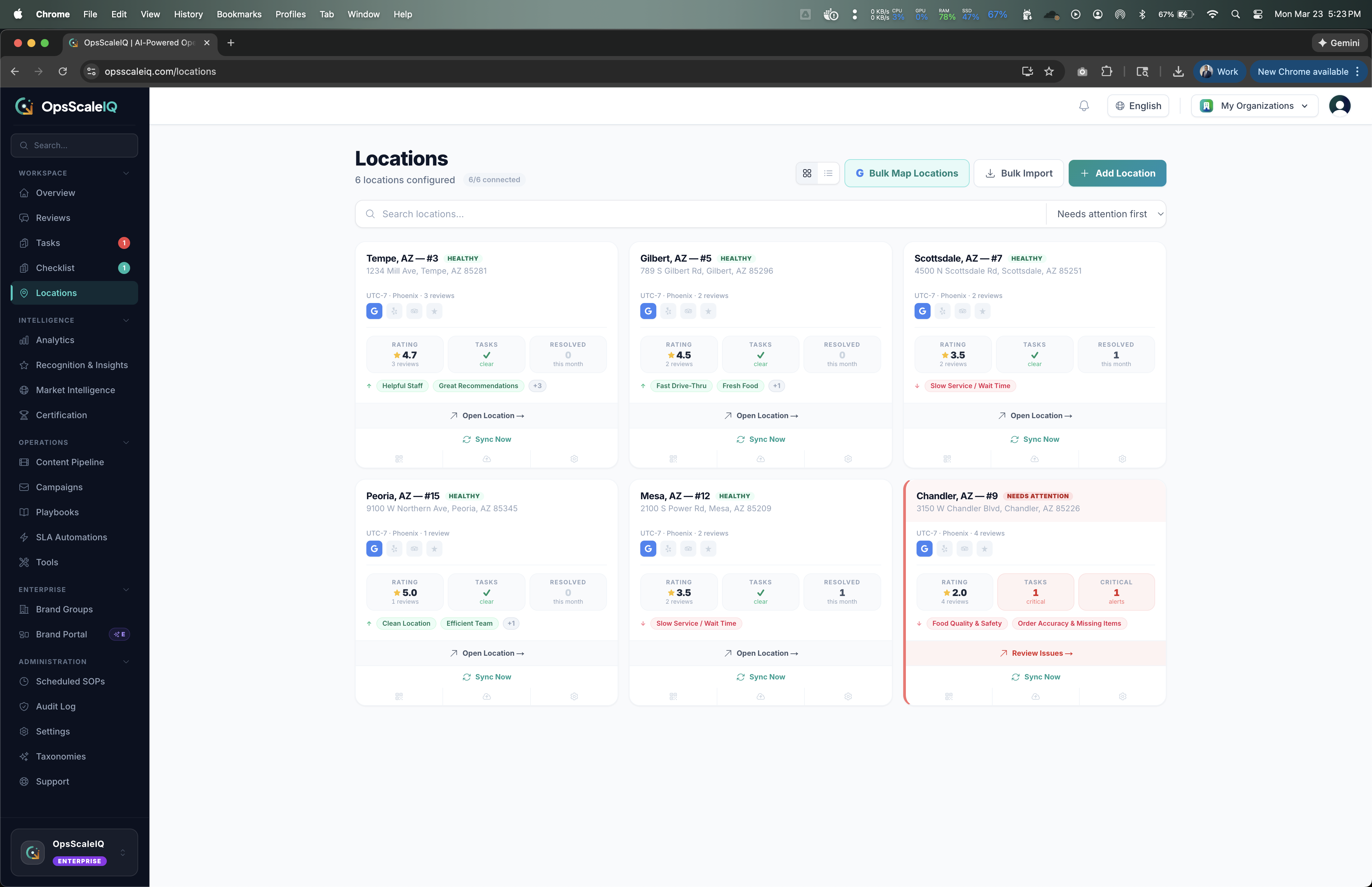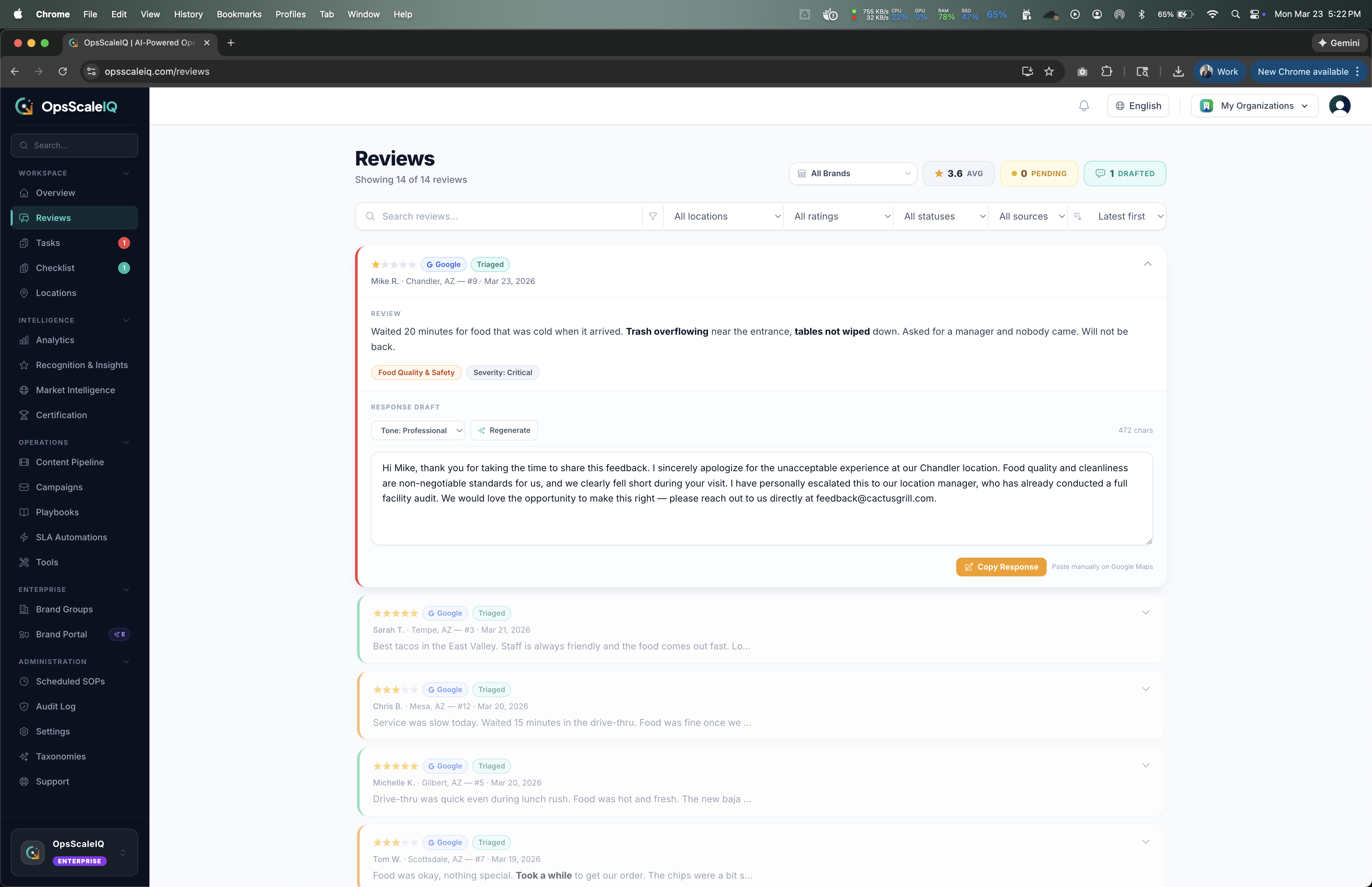 OpsScaleIQ is an operational intelligence platform designed for multi-location franchise operators managing anywhere from 5 to 5,000+ locations. It connects customer review data from Google, Yelp, Trustpilot, and TripAdvisor to internal operational workflows — closing the gap between what customers say publicly and what location managers do to resolve issues.