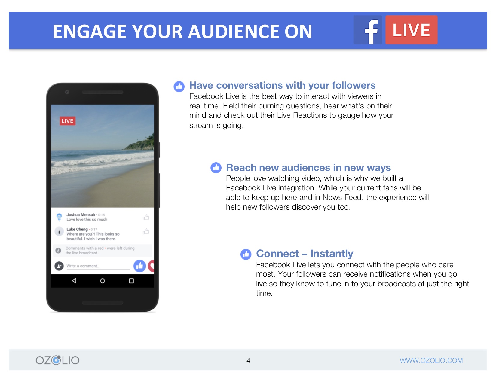 Broadcast to the largest audience in the world with the camera in your pocket. Live lets people, public figures and Pages share live video with their followers and friends on Facebook.