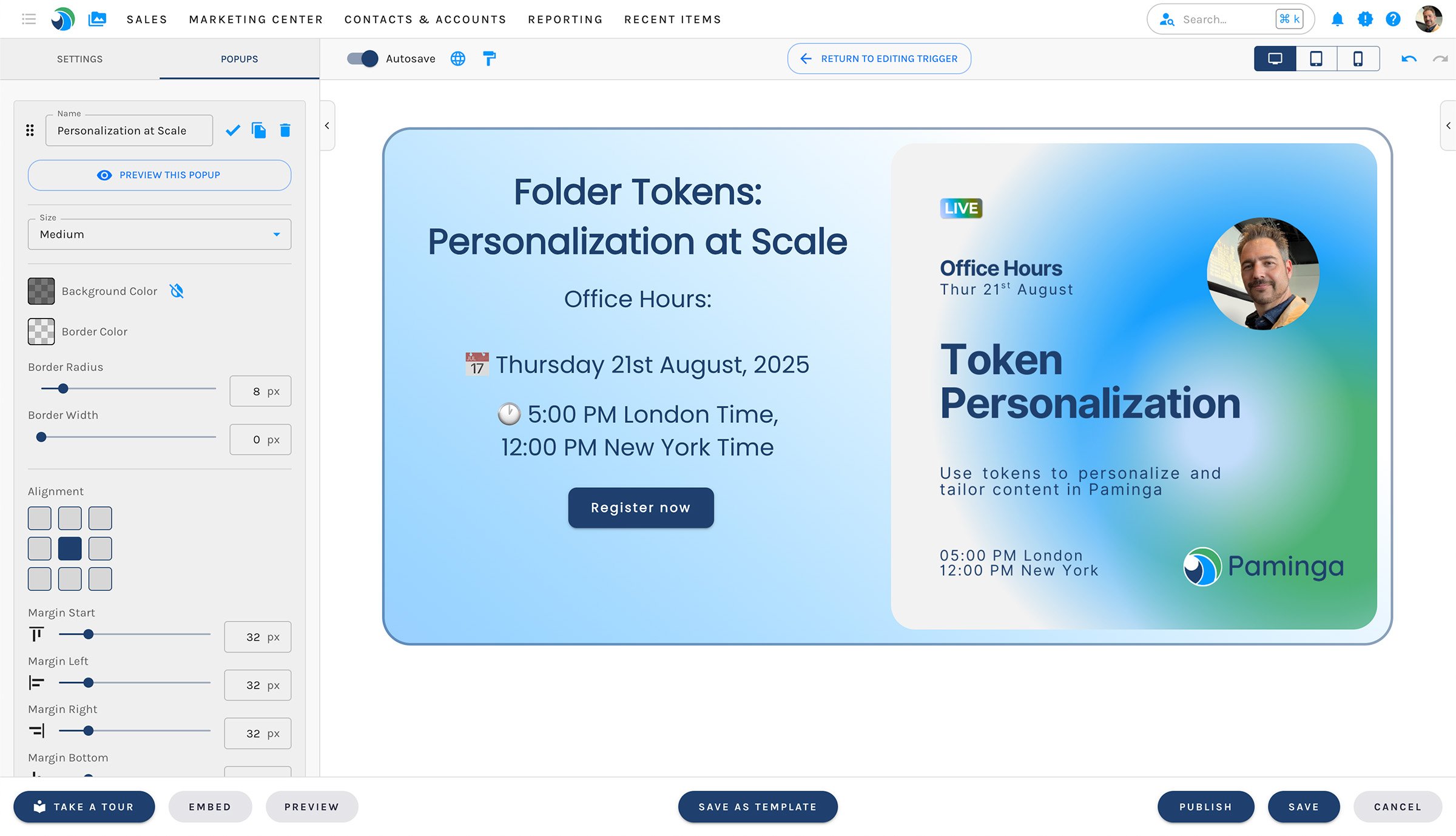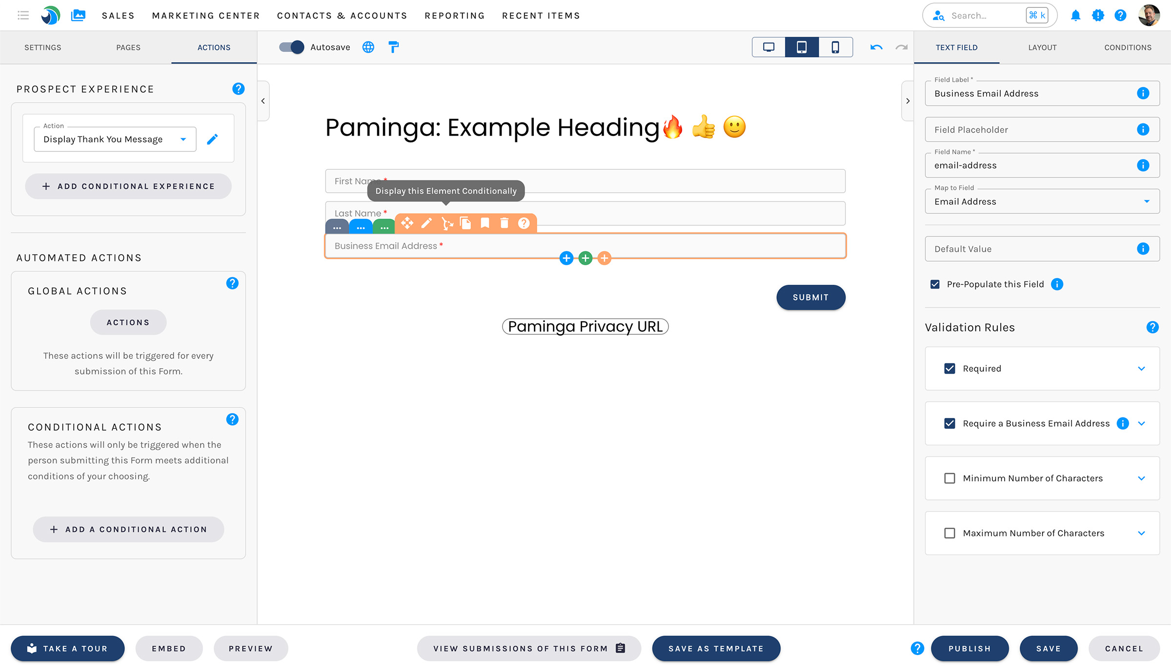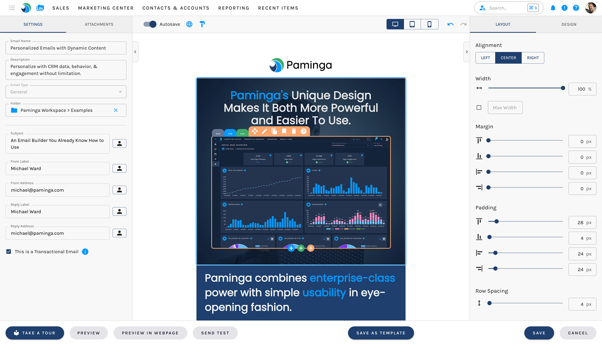 > Paminga is easy to use thanks to a great consistency on how you build emails, LP, CTAs, forms (same great editor) and how to manage the actions or the set of actions