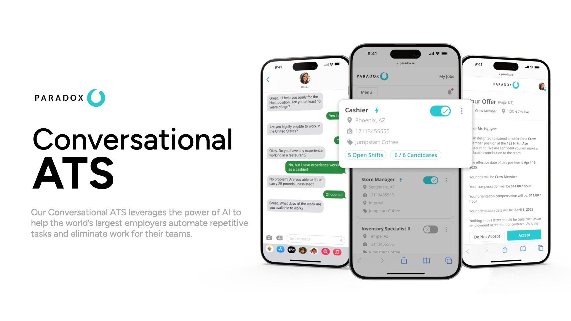 Paradox is a conversational AI platform that helps companies around the world transform the way they hire by automating time-consuming tasks. Established with the belief that hiring should be human-centric, fast, and simple, Paradox streamlines the hiring process by automating tasks like screening, interview scheduling, and candidate communication, allowing talent acquisition teams to focus on what matters most — building relationships and hiring the talent they need to fuel their business.