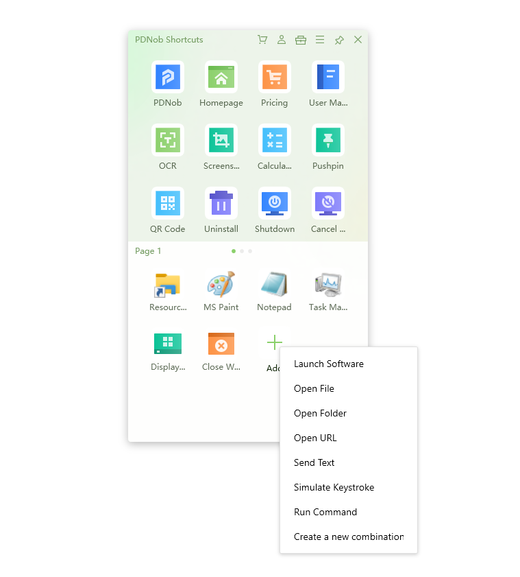 Besides working as a app launcher, PDNob Shortcuts is much more than that. The upper half of the interface contains build-in functions like OCR, Screenshot, QR code generator/identifier, Pushpin, etc. The bottom half allows us to customize windows shortcuts, stimulate keystrokes, send text templates, run commands, etc.