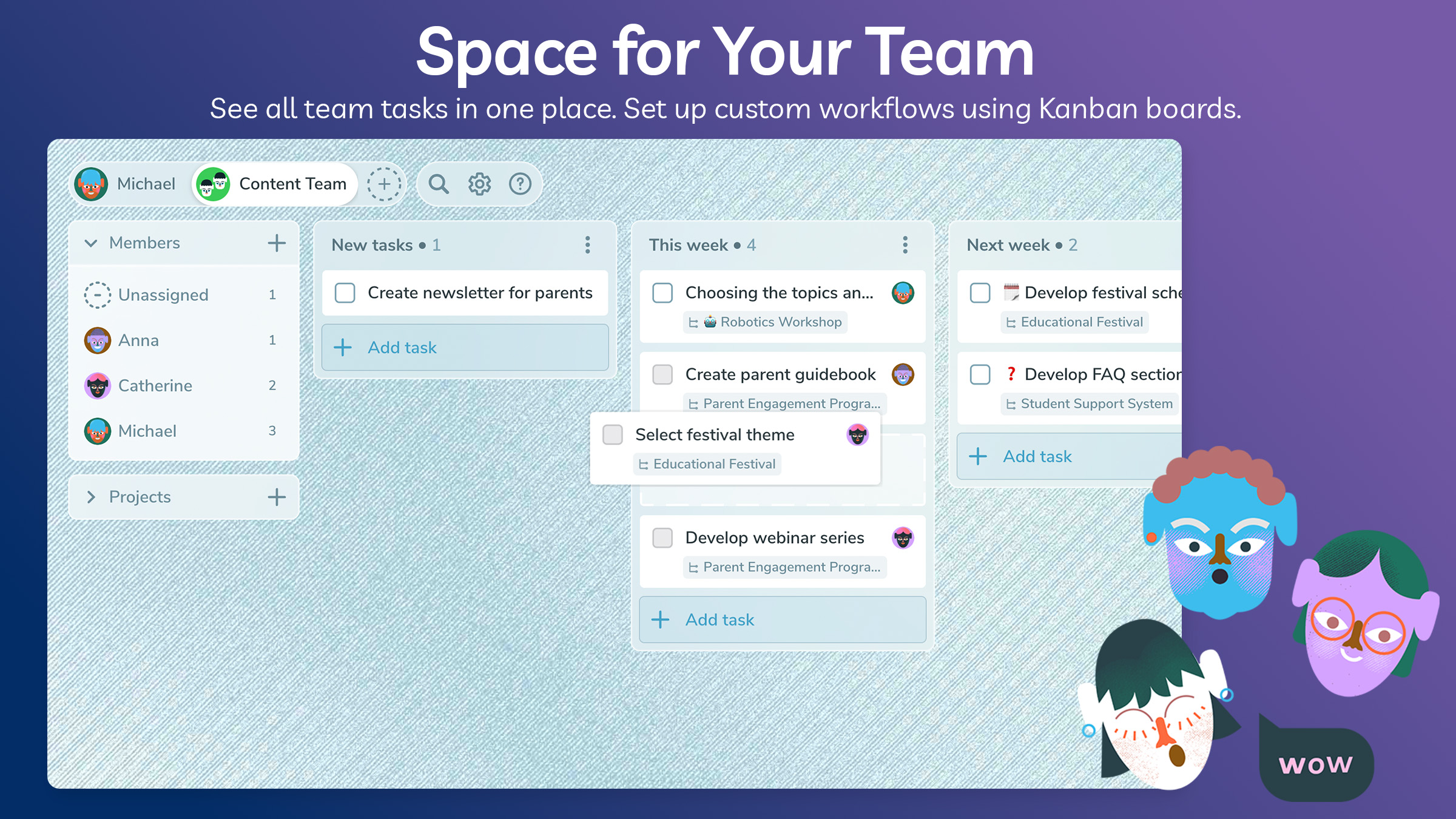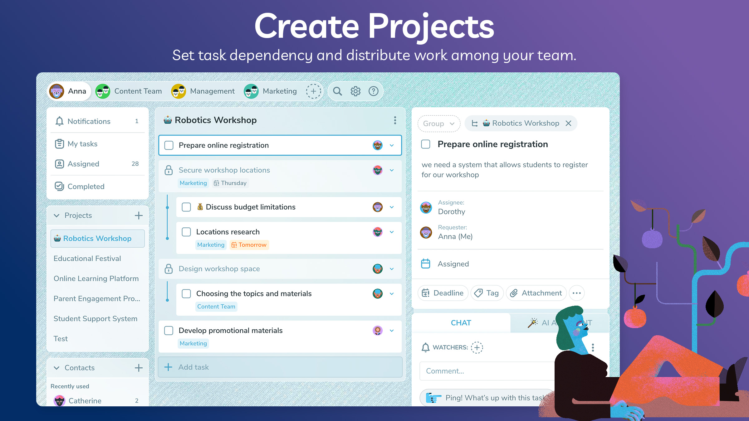 For teams, Ping offers robust collaboration tools that transform how you work together. Use Kanban boards to visually organize tasks, assign responsibilities, and track progress. Advanced project management features allow you to set dependencies, delegate tasks, and monitor team workflows. Notifications and mentions keep everyone on the same page, while tools like task tracking and approvals ensure accountability and transparency.