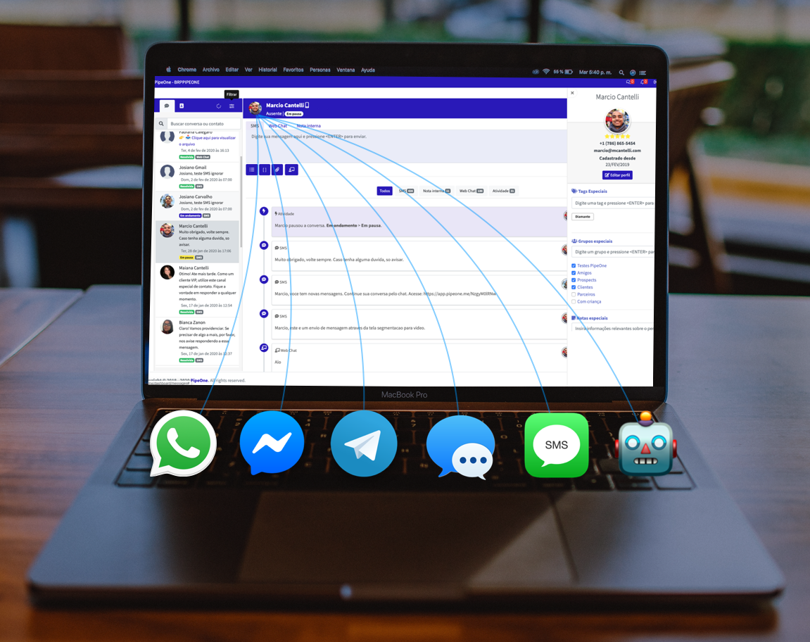 SMS, Whatsapp, Facebook Messenger, Telegram, webchat, chatbots... seamless communication with your contacts.