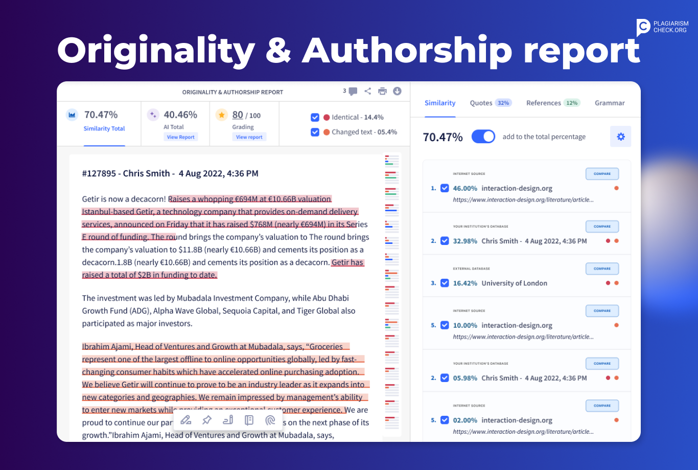 PlagiarismCheck.org is a reliable and easy-to-use advanced similarity and AI-checking tool that makes learning better and more honest by detecting similarities and chat GPT usage.