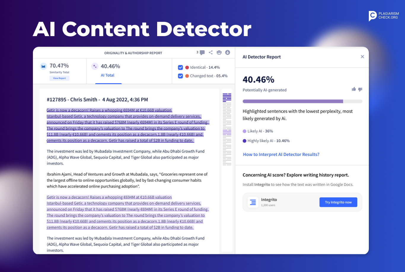 AI Detector — catches exact matches, paraphrased text, and ChatGPT usage.