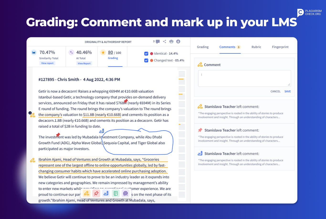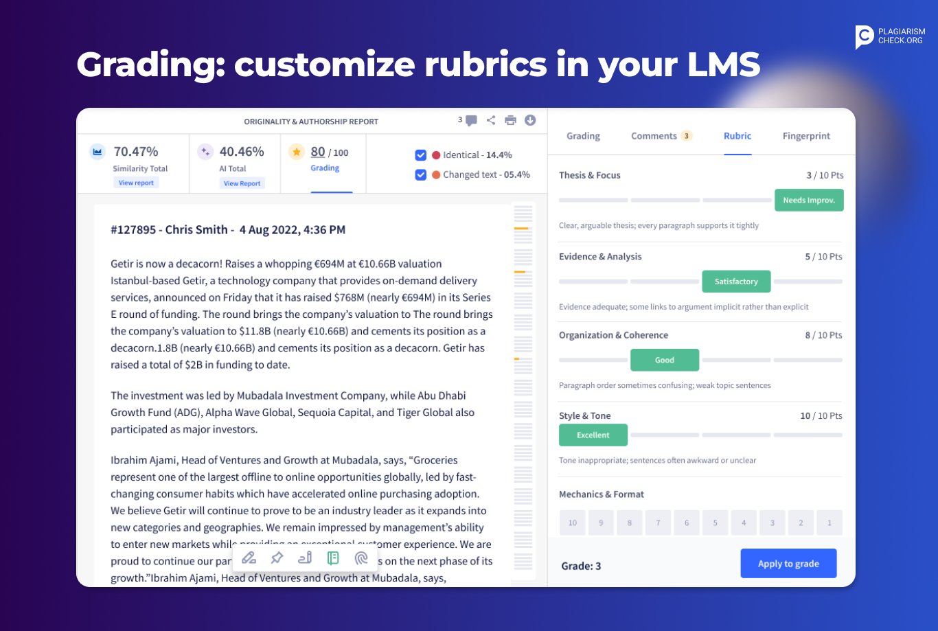 Grading — speeds up your workflow with custom rubrics and in-text comments.