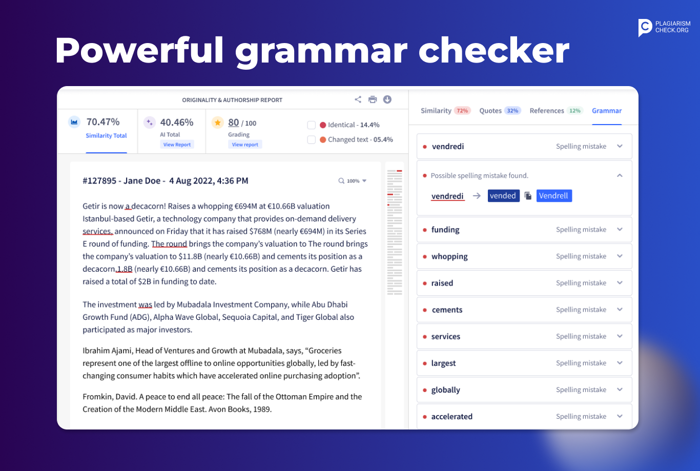 Its advanced AI algorithms catch changes in sentence structure, hidden characters, and synonyms. In addition, our tool recognizes properly formatted quotes and references, thus reducing the number of false alarms.