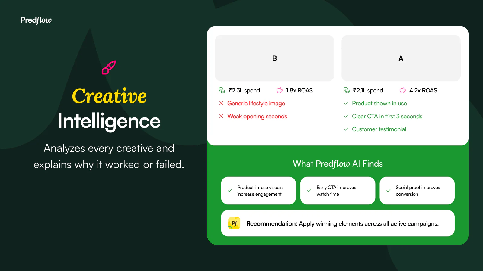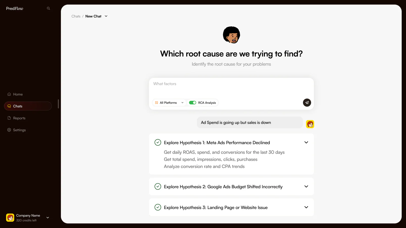 Predflow AI focuses on diagnostic analysis. Instead of only visualizing metrics, the system helps users understand why performance changes occur. It evaluates attribution behavior, campaign fluctuations, creative effectiveness, and anomalies using combined data from connected sources.