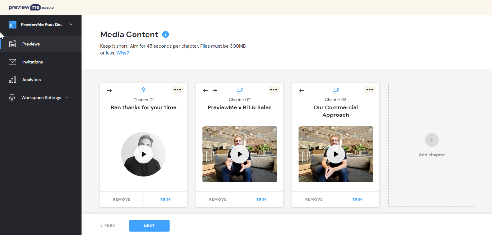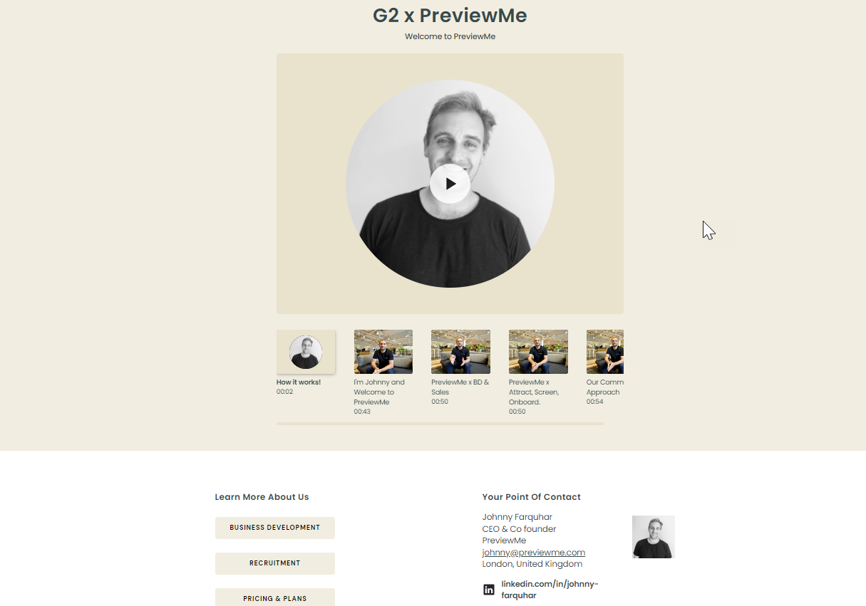 I mainly use PreviewMe for the email signature video. I include the GIF in every email and encourage prospective clients to click the video to learn more about my business and how I can help them. A lot of people have replied to my emails and commented on my videos, saying that they learned a lot about what I do from watching the quick 1 - 2 minute videos I provide, and that it was useful to them. I love that for the people that watch them, it instantly gains way more trust than just words on a screen from "other annoying sales rep trying to sell me their services", and they actually get to know me without having to schdeule a call. The reason I use PreviewMe is to give semi interested people an opportunity to reply and find out more. Review collected by and hosted on G2.com.