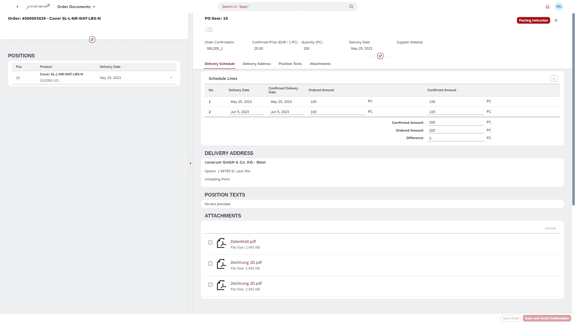 Leverage our platform for seamless transfer of purchasing documents, scheduling agreements, and call-offs. Suppliers gain an overview of received documents, can confirm them, adjust delivery details, and conveniently access printouts generated in SAP ERP.
