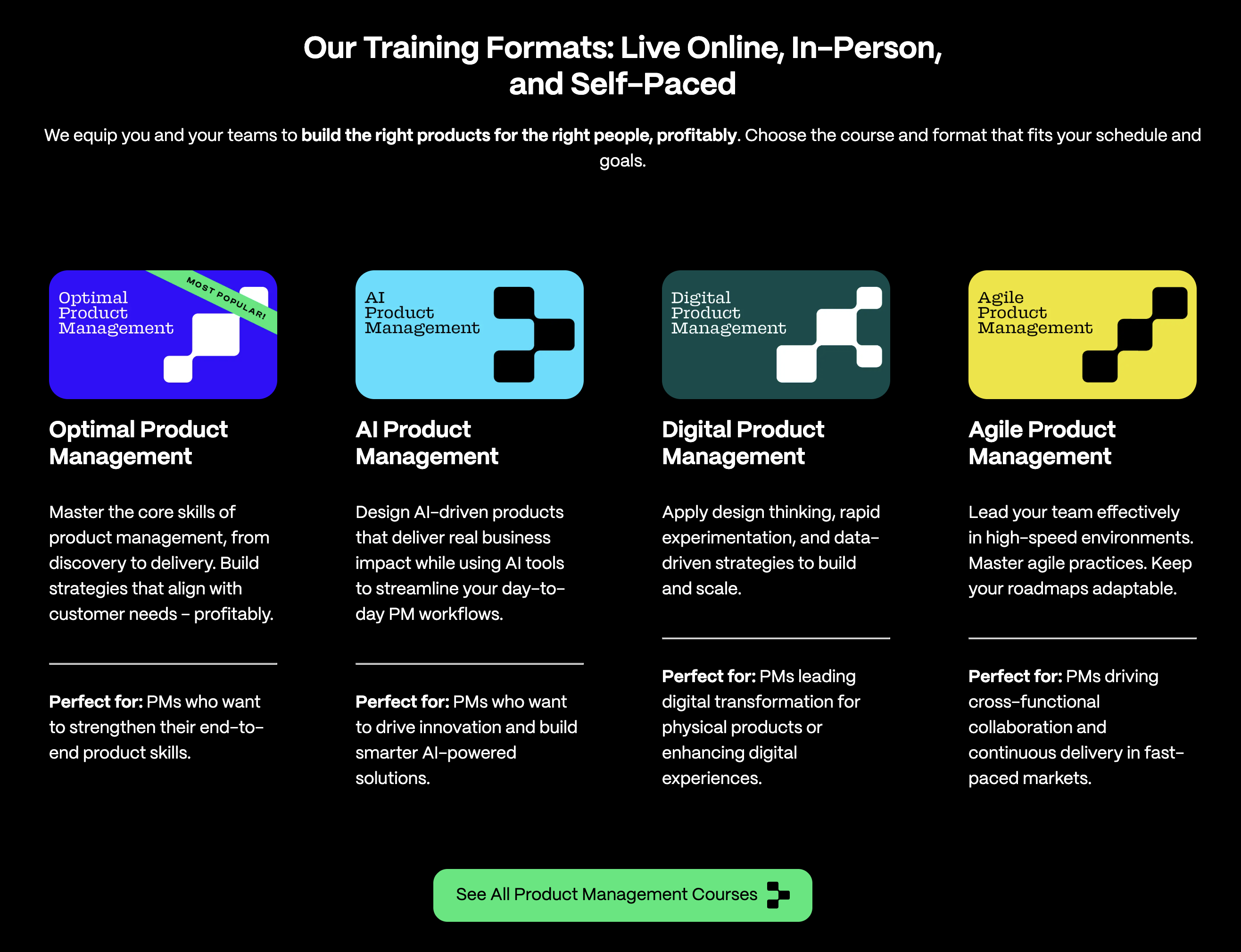 Our Training Formats: Live Online, In-Person, and Self‑Paced We equip you and your teams to build the right products for the right people, profitably. Choose the course and format that fits your schedule and goals.