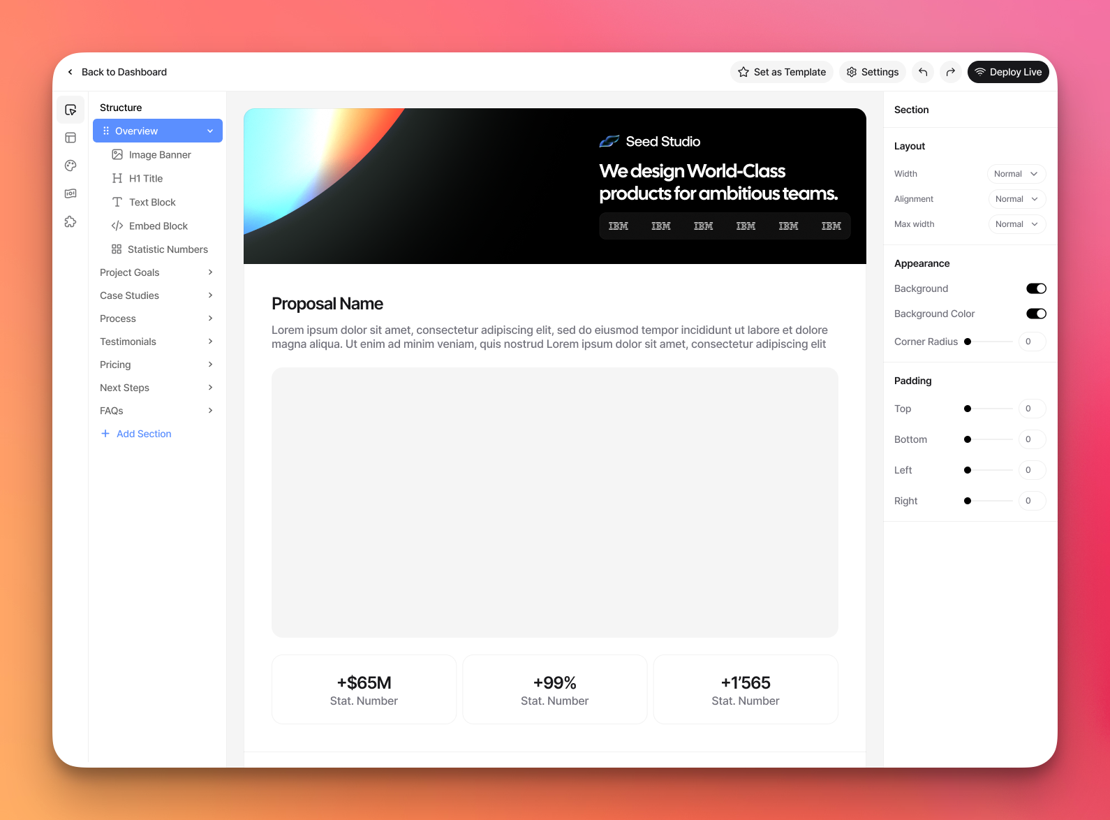 Save time and win more work by replacing your sales documents with interactive & mobile-friendly webpages that plug into your systems and are as easy to build and reuse as they are beautiful.