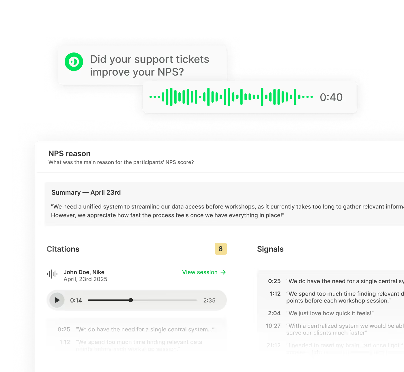 Conduct and analyze AI voice interviews on your behalf—turning qualitative research into a fast, scalable, and continuous process.