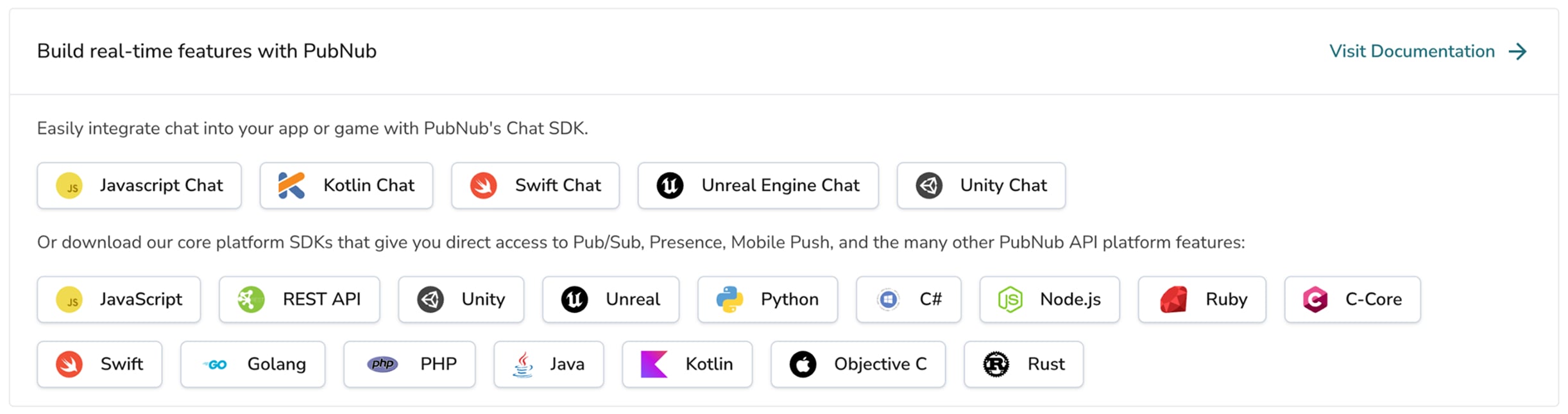 * We have developed over 50+SDKs and over 65 pre-built integrations with external and third-party APIs, PubNub gives developers the features they need regardless of programming language or tech stack.