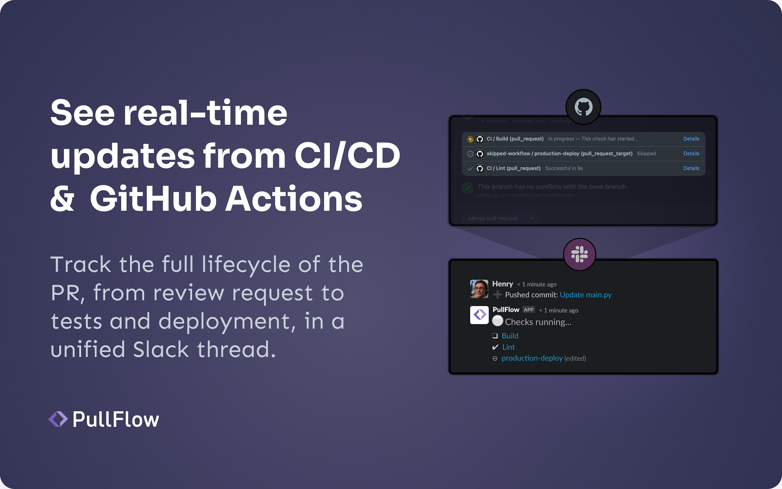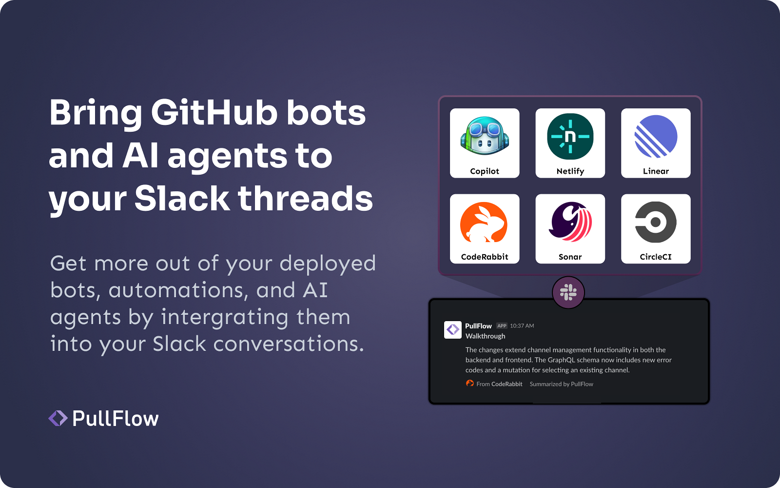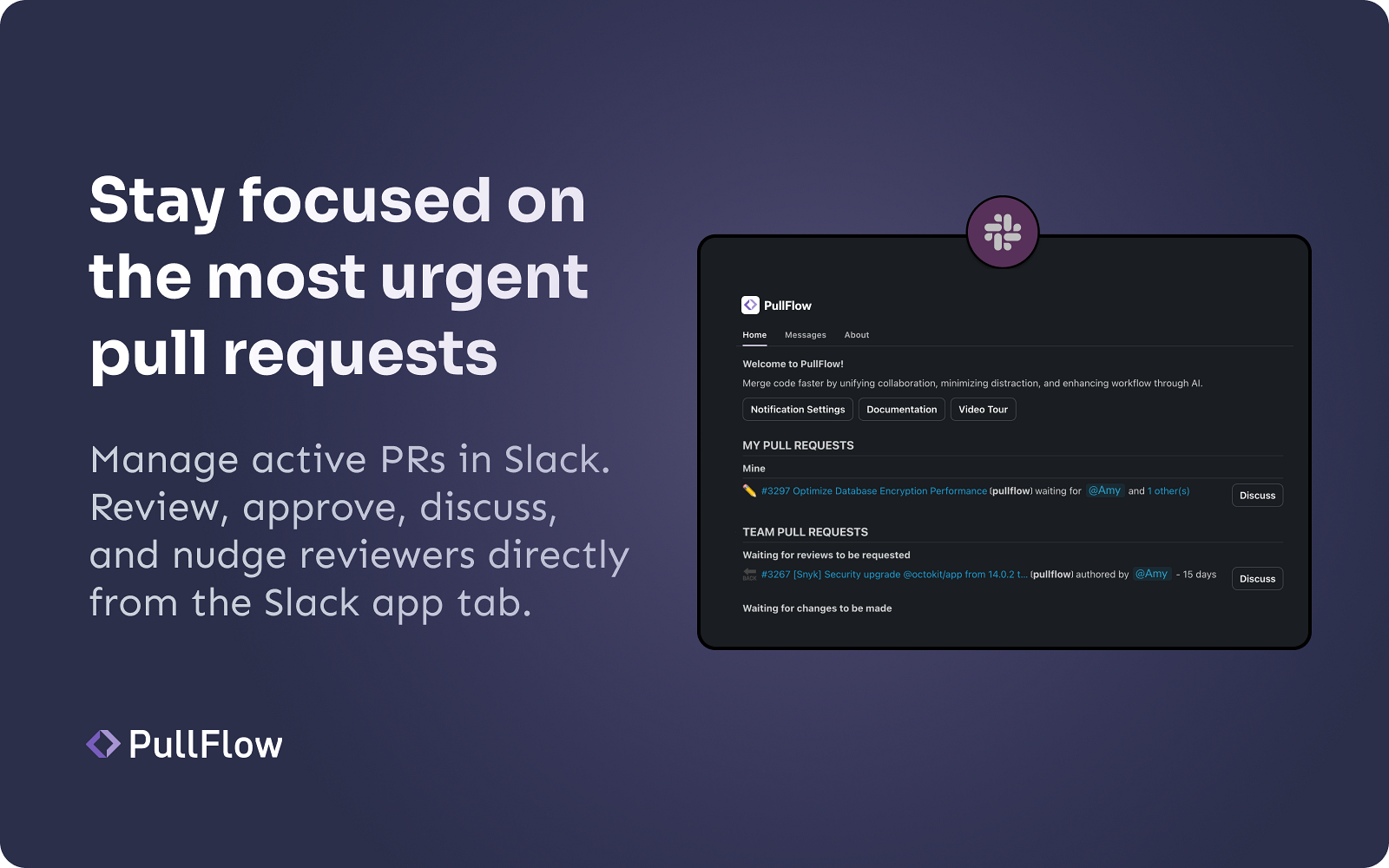 Tired of bouncing between Slack, GitHub, and VS Code/Cursor? PullFlow brings bi-directional sync, AI-powered insights, and actionable updates into your Slack workspace—so your team can review, discuss, and approve pull requests without breaking focus.