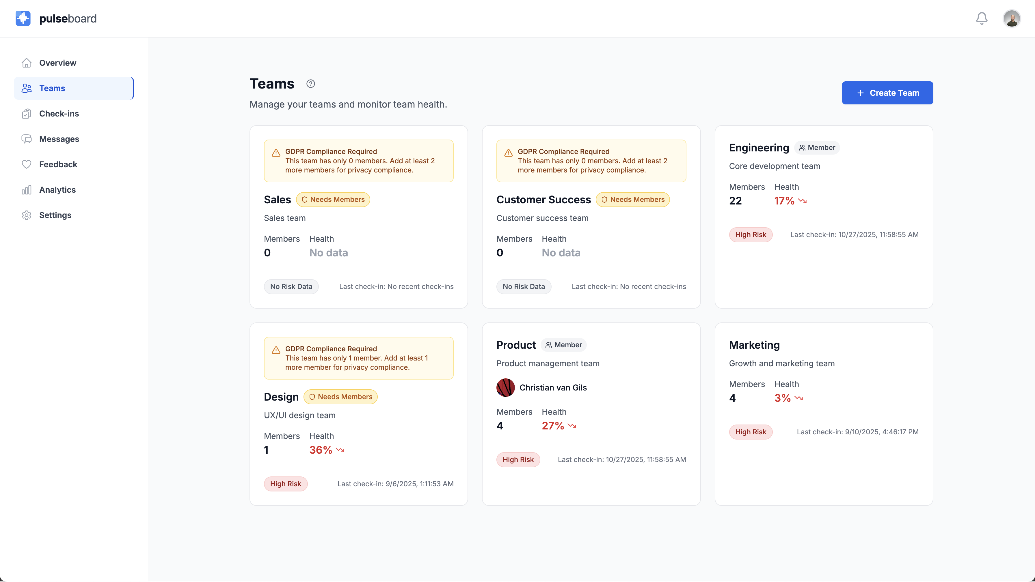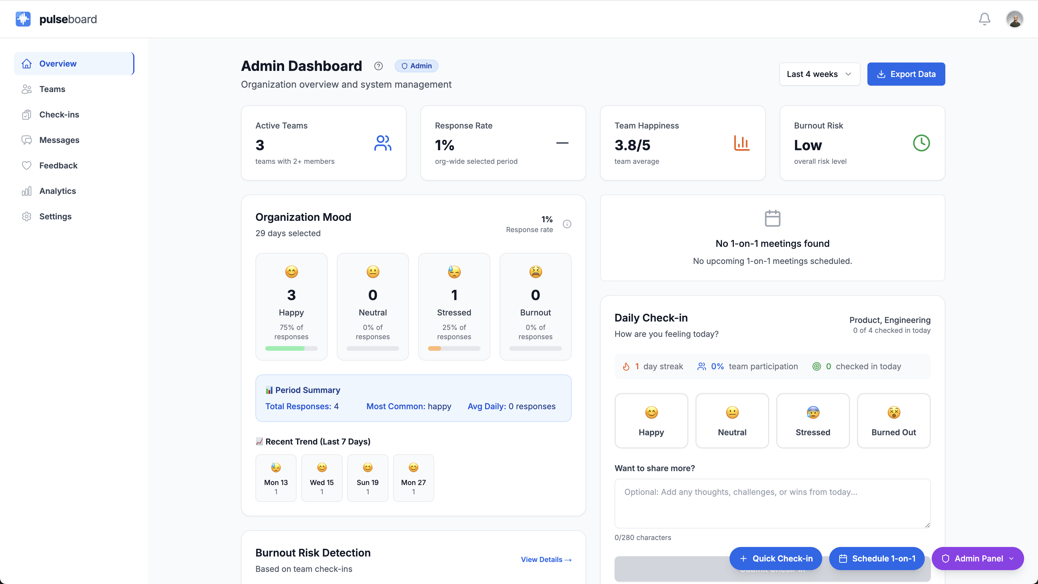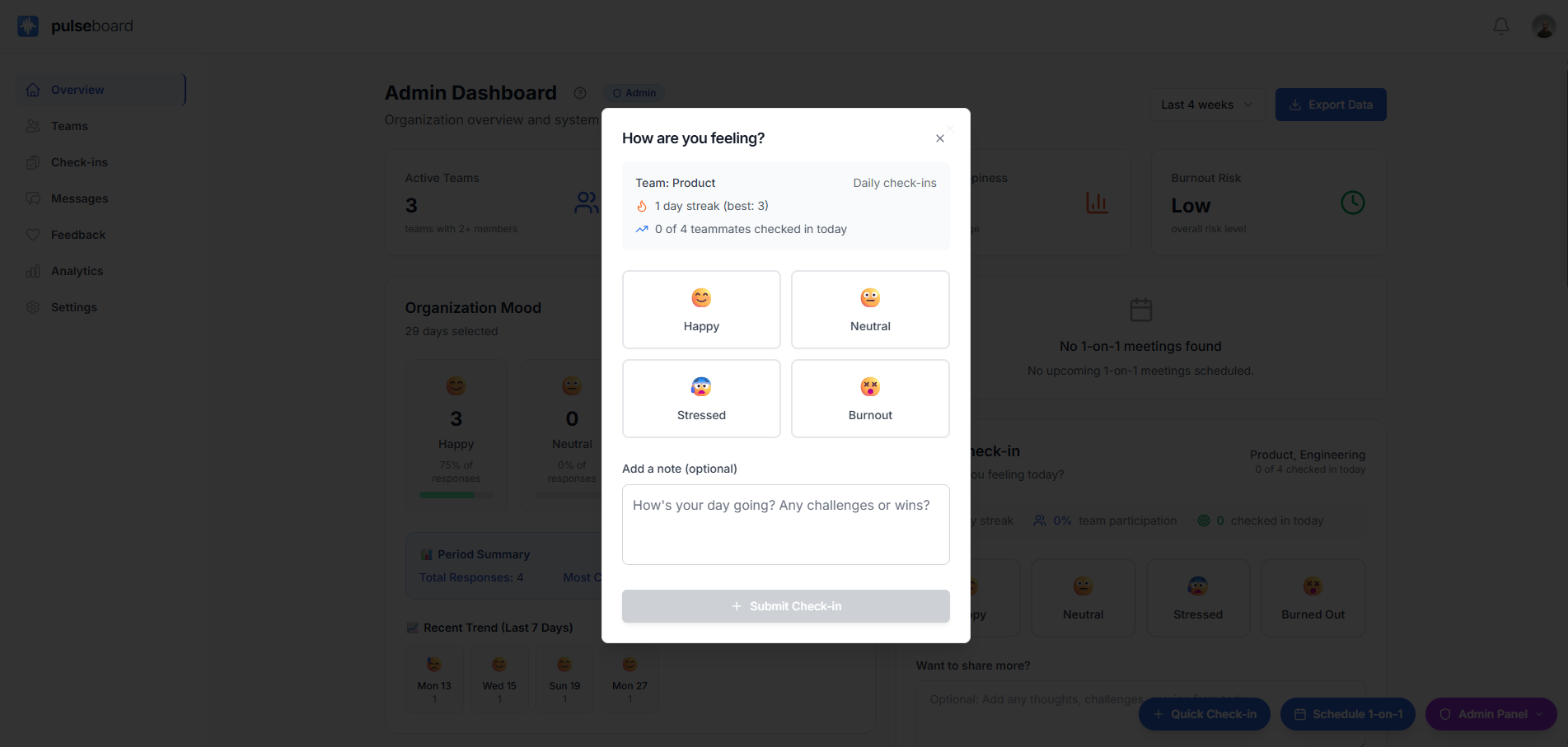 PulseBoard is a lightweight wellbeing and burnout-prevention platform designed specifically for remote and hybrid teams. It gives leaders real-time visibility into team sentiment, stress levels, and workload pressure—without adding extra work, meetings, or complex HR processes.