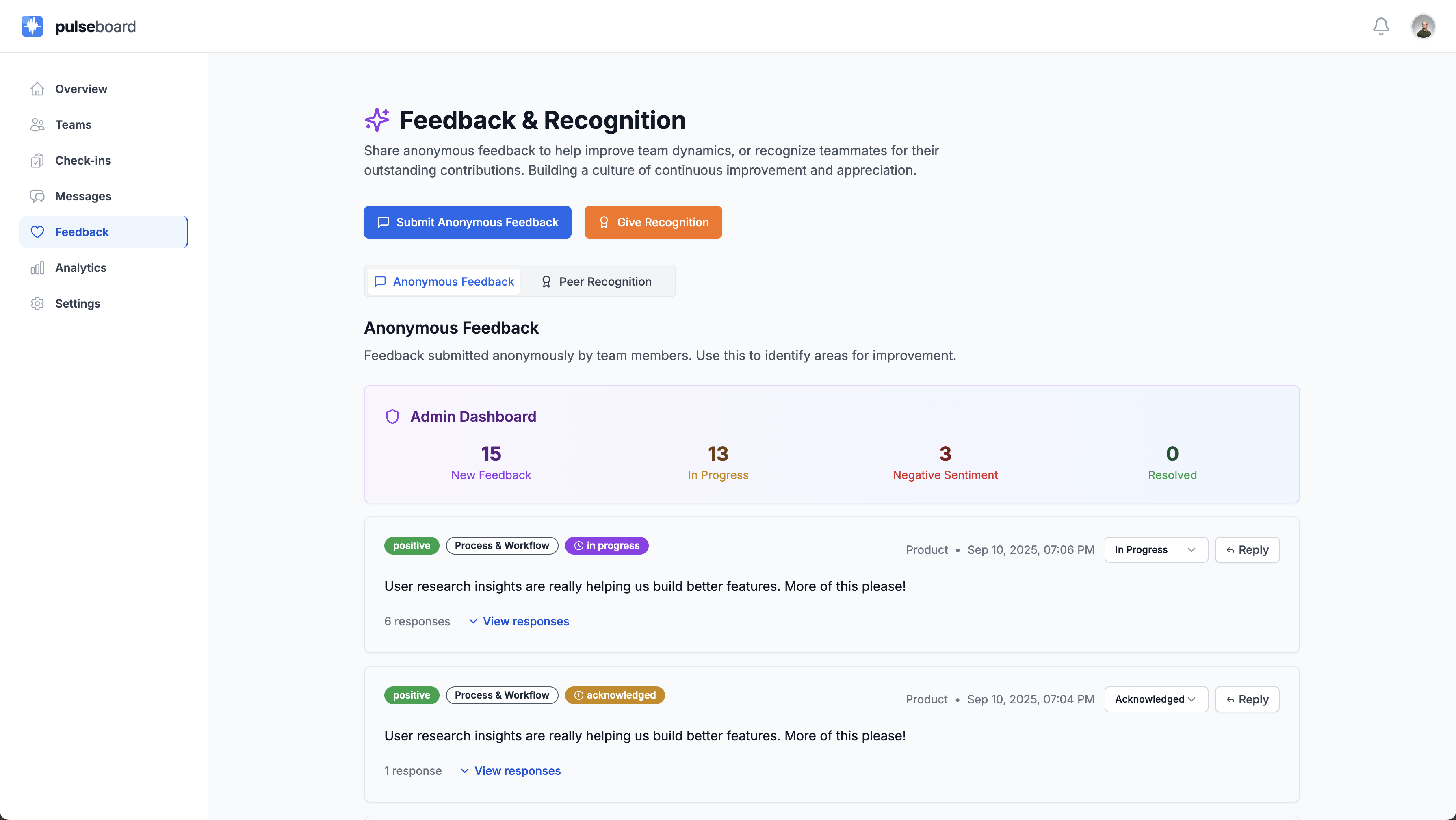 All responses are fully anonymized and aggregated—never shown individually—so teams feel safe being honest. PulseBoard then transforms these micro-check-ins into clear wellbeing trends, letting managers identify issues early: stress spikes, sudden energy drops, signs of team fatigue, communication overload, and more.