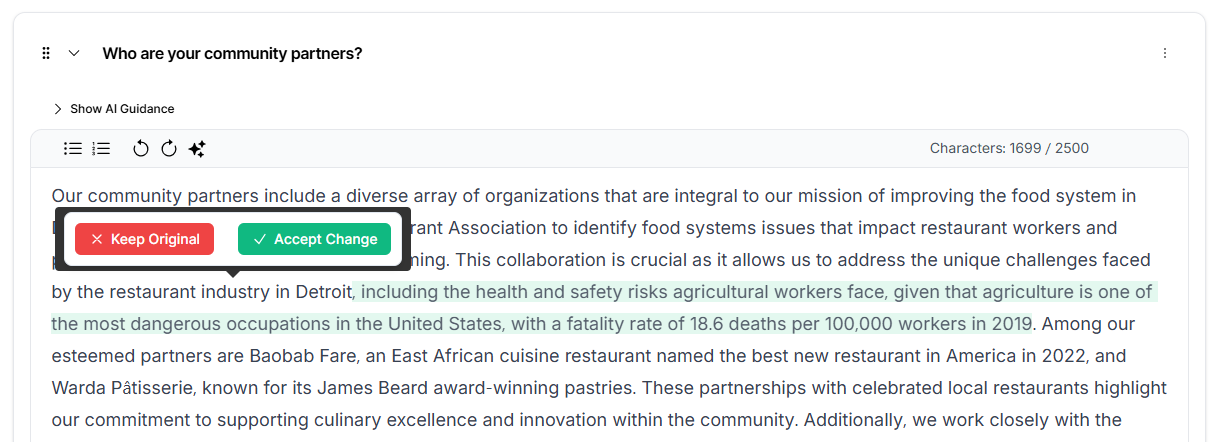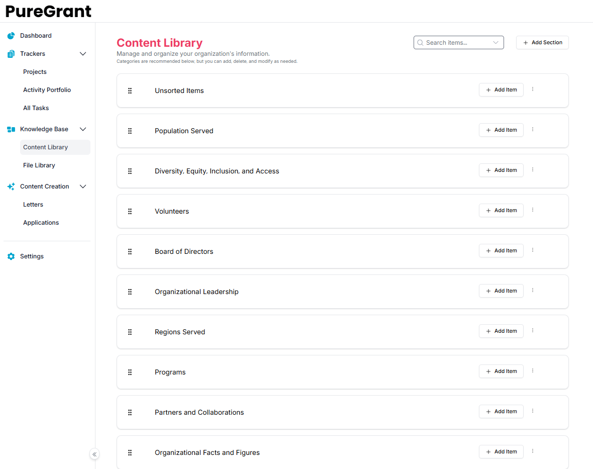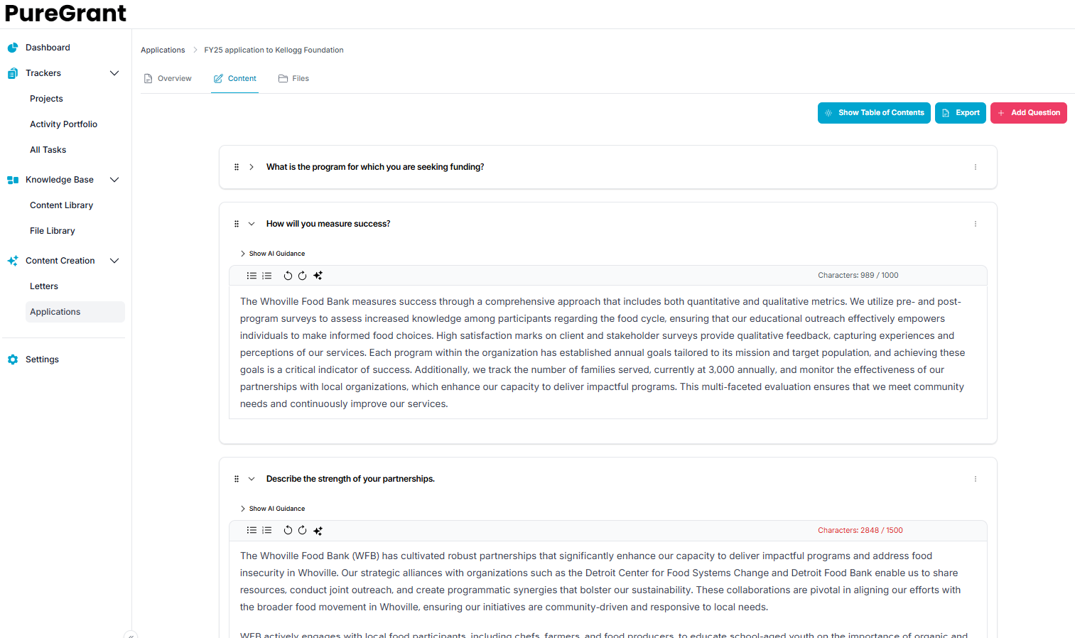 PureGrant is not like other AI writing tools and platforms. The platform is highly unique and customized because the user feeds (uploads) documents into the system such as annual reports, brochures, prior grants, letters, reports, etc. With this content library, PureGrant (PG) quickly pulls from those resources to create materials completely customized to your nonprofit (almost instantaneously)