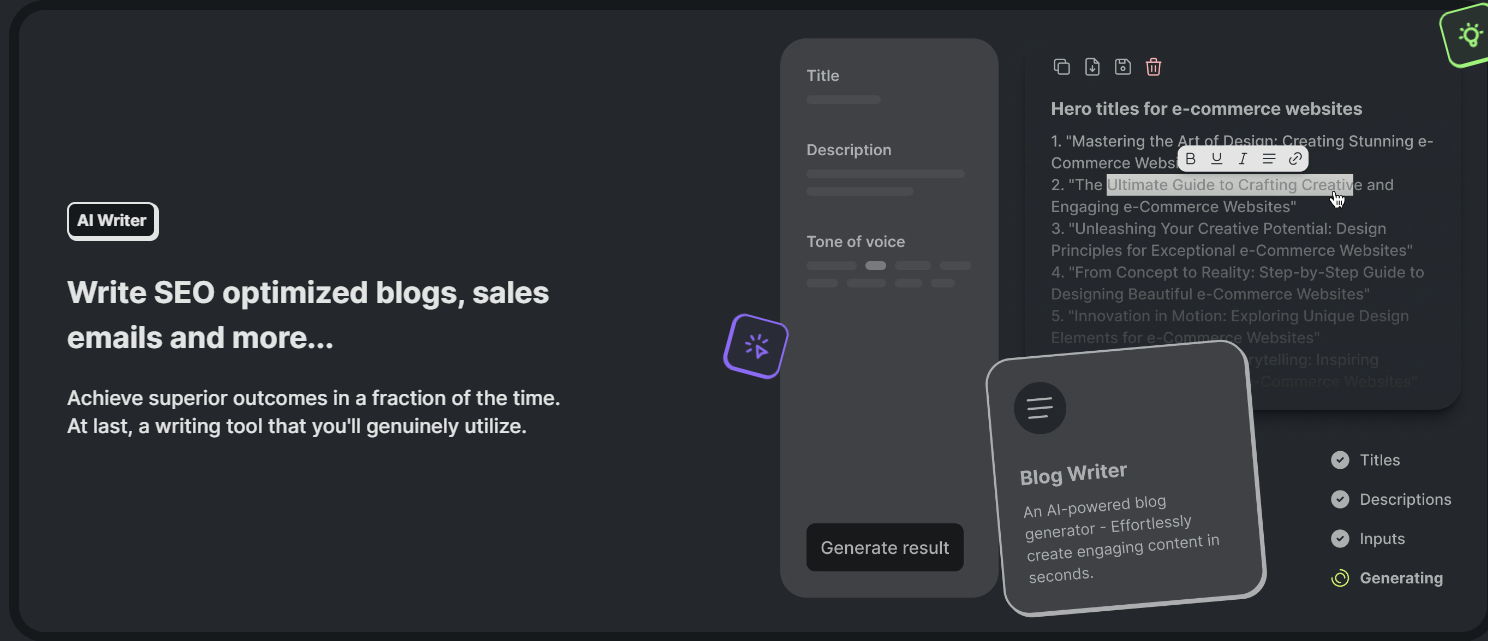 Content generation of imagery and long or short form articles is available. Dozens of templates ensure SEO-based blogs are quickly created.