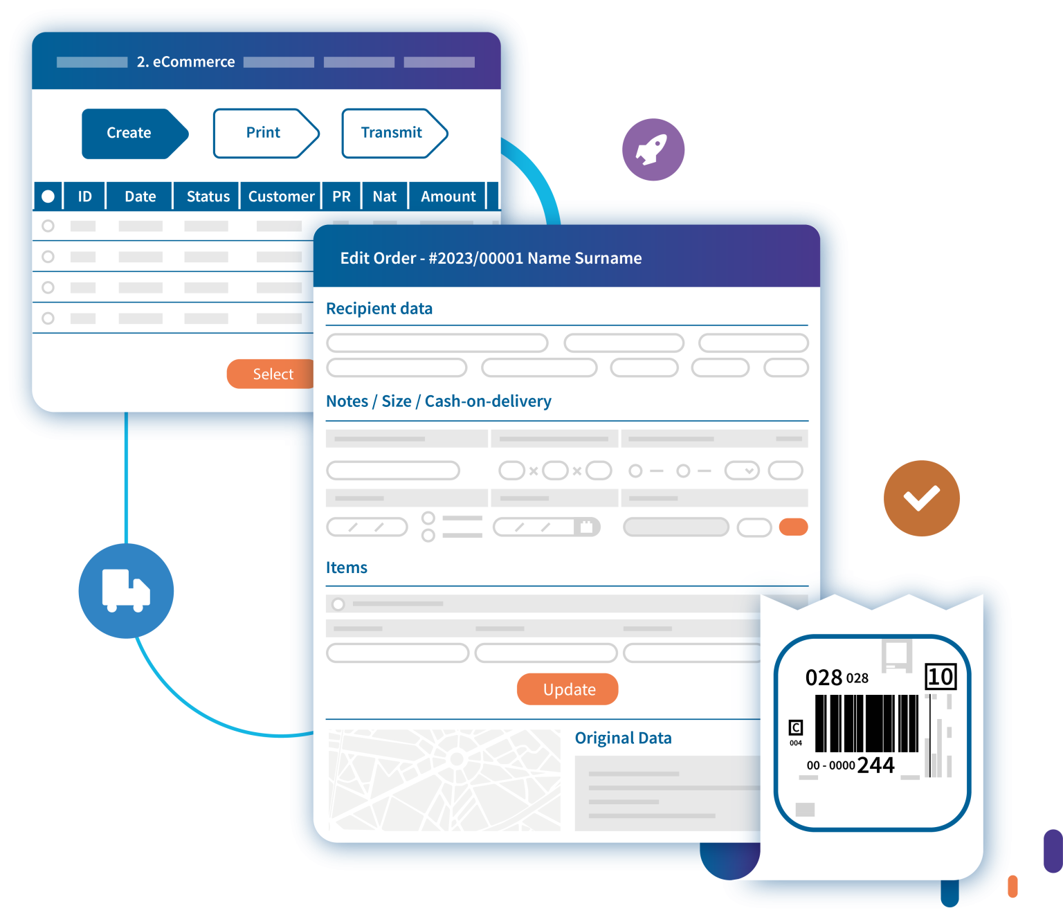 Qapla’ directly imports orders from your eCommerce platform. Not only that: it generates shipments and prints courier labels with 3 clicks or automatically via API. The system transmits delivery information in real time to the selected courier, without you having to contact them.