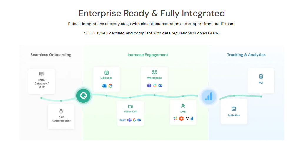 - Enterprise Integrations & Security: Connect with HRIS, calendars, and communication tools; SOC II Type II compliant